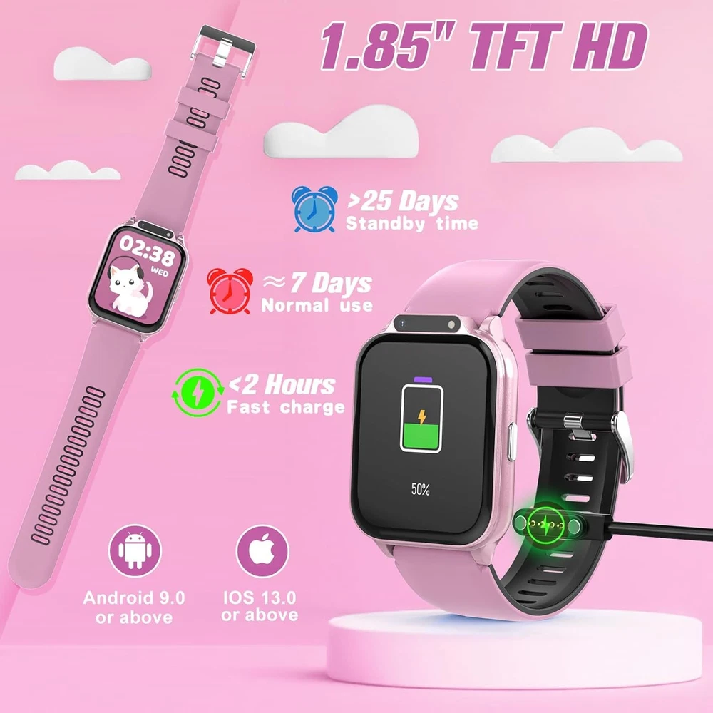 This smartwatch is a fantastic gift for kids! The vibrant purplish pink color is eye-catching, and the 1.85" screen is perfect for little hands. It tracks steps, heart rate, and sleep, helping kids stay active and healthy. The IP68 waterproof rating means no worries about spills or rain. My child loves the fun features, and I appreciate the peace of mind it brings. Great battery life too—definitely worth it!