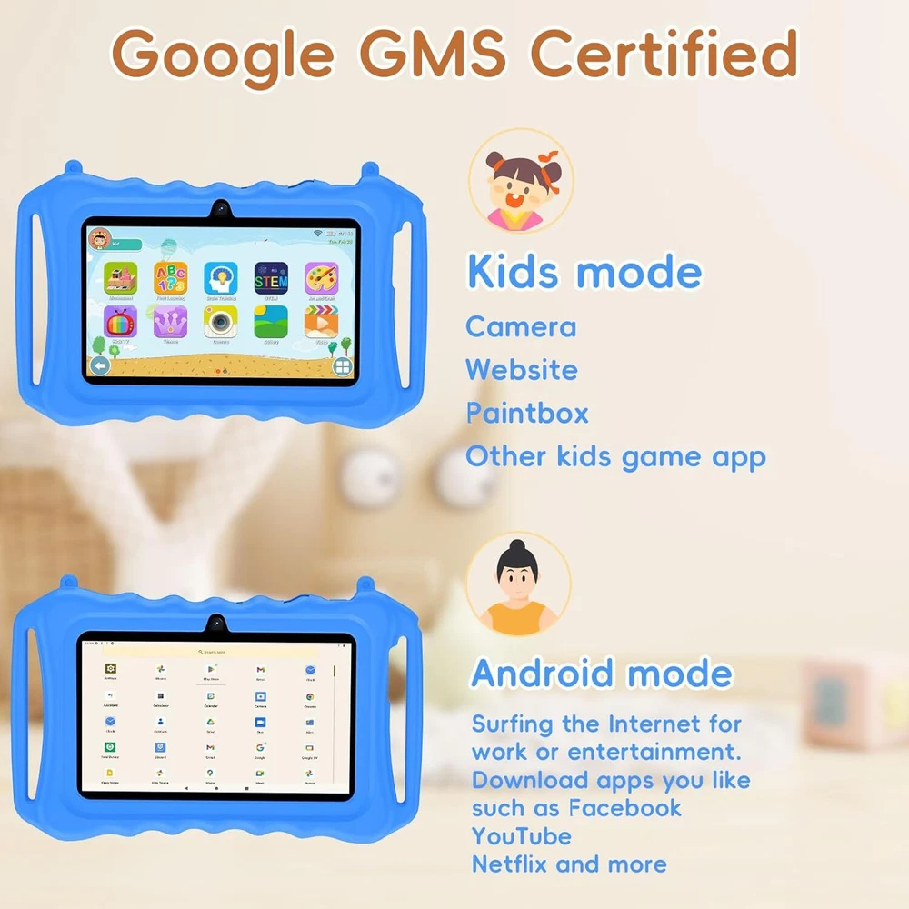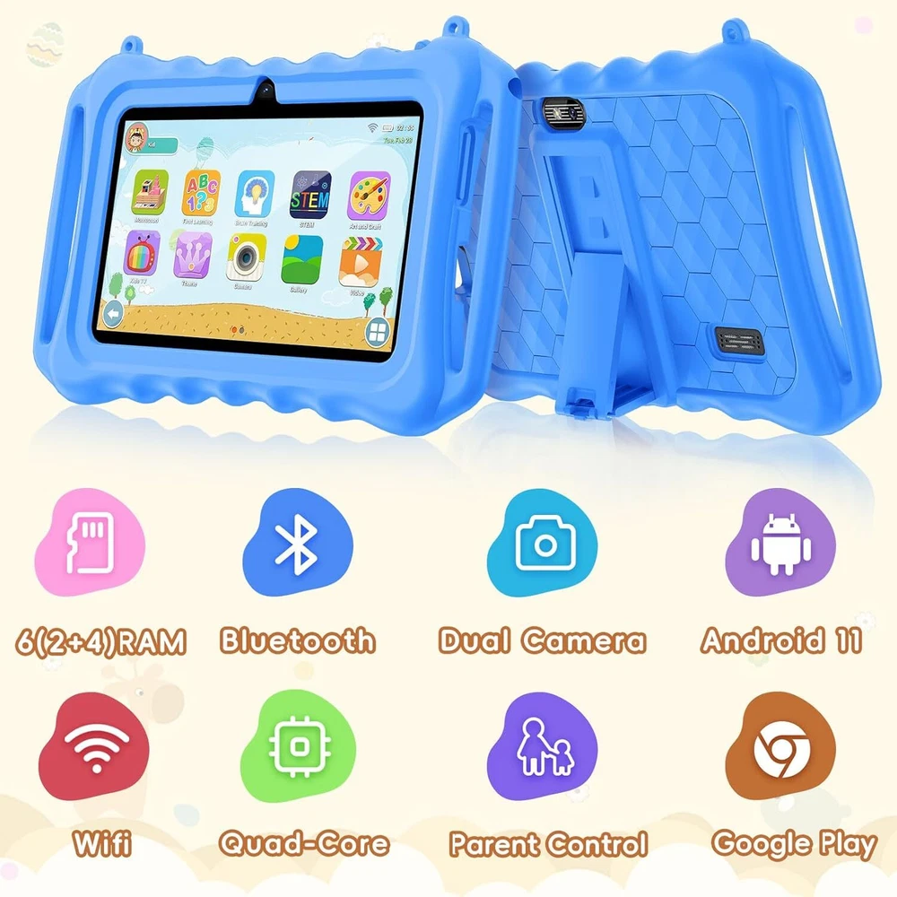 Kids Tablet, 7 inch Android 11 Tablet for Kids, 6GB(2+4) RAM 32GB ROM Blue Product Details Brand: aiprotablet Model Name: N07 Memory Storage Capacity: 32 GB Screen Size: 7 Inches Display Resolution Maximum: 1024x600 Pixels Full-Featured Kid-Safe Tablet - The kid's tablet runs the latest Android 11 operating system and supports Wi-Fi 2.4GHZ , a new WiFi transceiver channel that improves the speed and stability of network connection. Includes dual speakers, Bluetooth 4.2, FM radio for online learning and video calls. More features for fun and productivity. Parental Control Mode - This 7-inch tablet for kids offers a user-friendly interface and comes pre-loaded with the iWaWa app and games for kids to learn and play with. With comprehensive parental controls, you can easily manage your child's screen time, set educational goals, and as your child grows, these Settings can be adjusted for their age. Dual Cameras + Friendly design - The Android 11 tablet has dual built-in cameras with a 2.0 MP front camera and a 2.0MP rear camera. Specially designed kid-friendly shock-proof strap holder case made of soft silicone material to protect your children's tablet from scratches, dust, bumps and drops. Children don't have to hold tablets all the time while studying, watching and playing games. Storage and Eye Care - Children's tablet dedicated to children's eye care HD 1024*600 IPS screen resolution, wide viewing angle provides a more realistic viewing experience. Reduce eye fatigue and protect eyesight. With a powerful quad-core CPU, 6GB(2+4) RAM, 32GB ROM storage (expandable up to 128GB), and easy multitasking.
