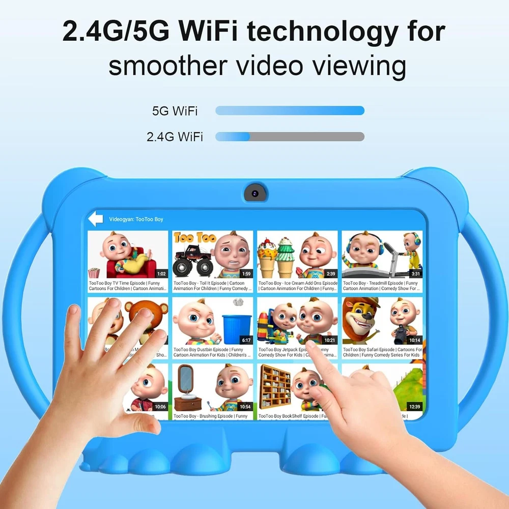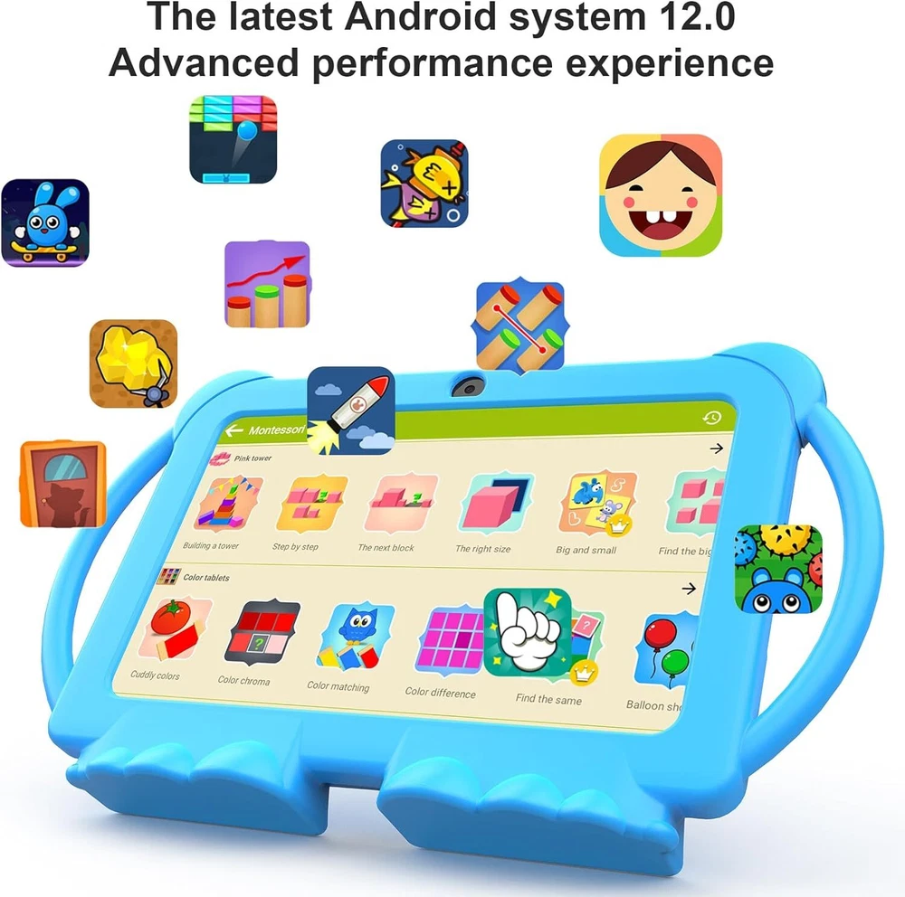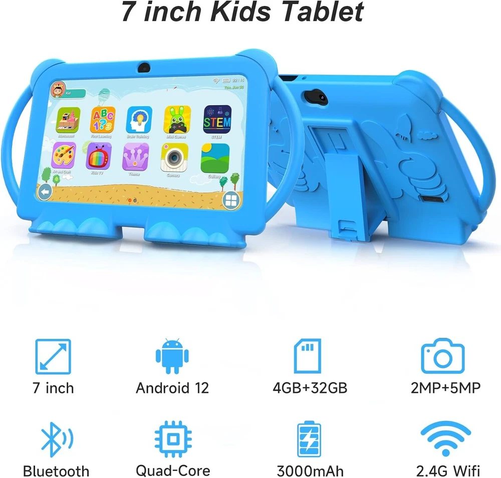 Kids Tablet, 7 inch Android 12 Tablet for Kids, 4GB RAM 32GB ROM 512GB Blue Product Details Brand: HDTABLET Model Name: HDQ8K Memory Storage Capacity: 32 GB Screen Size: 7 Inches Display Resolution Maximum: 1024 x 600 Pixels 【Android 12 Safe Kids Tablet】Our kids tablet comes with advanced Android 12, powerful quad-core processor for smoother opening of apps and loading of pages.4GB RAM (2+2 Expandable), 32GB ROM, 512GB Expandable, WIFI, Bluetooth, 5MP Rear + 2MP Front Camera, 3,000 mAh battery ensures hours of use. hours of use. The fully upgraded tablet is ideal for children. 【Parental Control Mode】This 7 inch android tablet for kids has an excellent parental control mode that makes it easy to personalize the screen, time limits, set educational goals and filter age-appropriate content. It also expands the kid-friendly environment as your child grows, downloads new apps and manages playtime. With this toddler tablets, you won't have to worry about your child's online safety. 【Kid-friendly Puzzle Content】This toddler tablet come preloaded with several kid-friendly apps that store tons of your kids' favorite cartoons, online books, songs and photos to build their skills and imagination. As your child grows up, our tablets can add age-appropriate apps to keep your child healthy and happy. 【Eye Protection Screen + Shockproof Case】The 7 inch children's tablet is equipped with a high-quality 1024x600 IPS display, the screen is clear and bright, and the automatic brightness adjustment function can better protect your eyes and reduce eye fatigue. The silicone case specially designed for kids can protect the toddler tablet from scratches, drops and other injuries, the easy to grip handle and standable design eliminates the need for kids to hold the tablet all the time. 【Surprise Gifts for Kids】Still struggling to find the perfect gift for your child's birthday, Children's Day, Christmas or any special occasion? The Q8K kids tablets is specially designed with Parental Control Mode, Kid Friendly Content, Eye Protection Mode and Silicone Protective Sleeve that are ideal for you. If you have any questions, please feel free to contact us, we will give you a satisfactory answer within 24 hours.