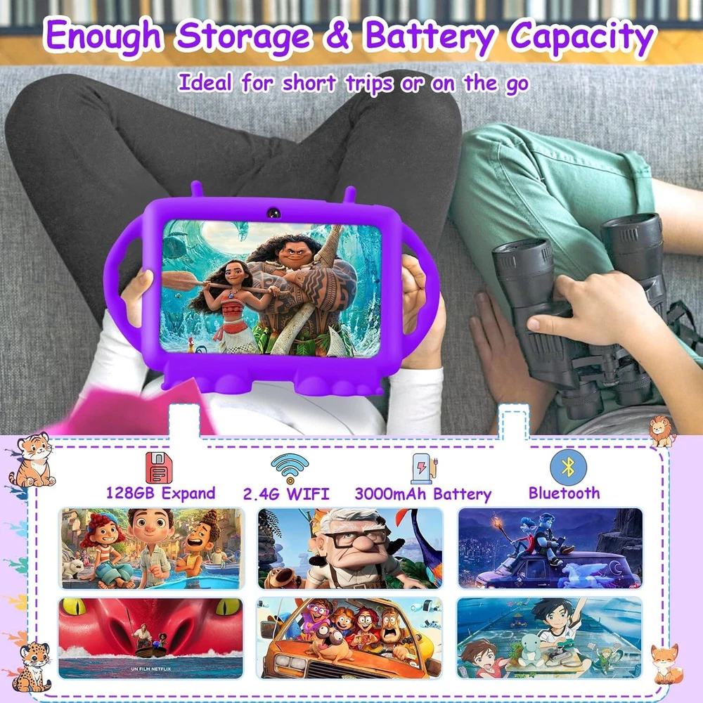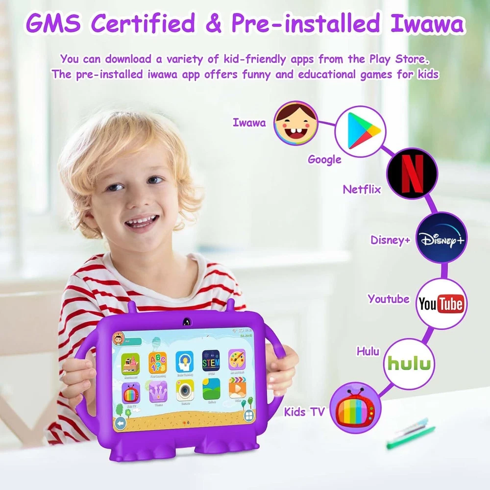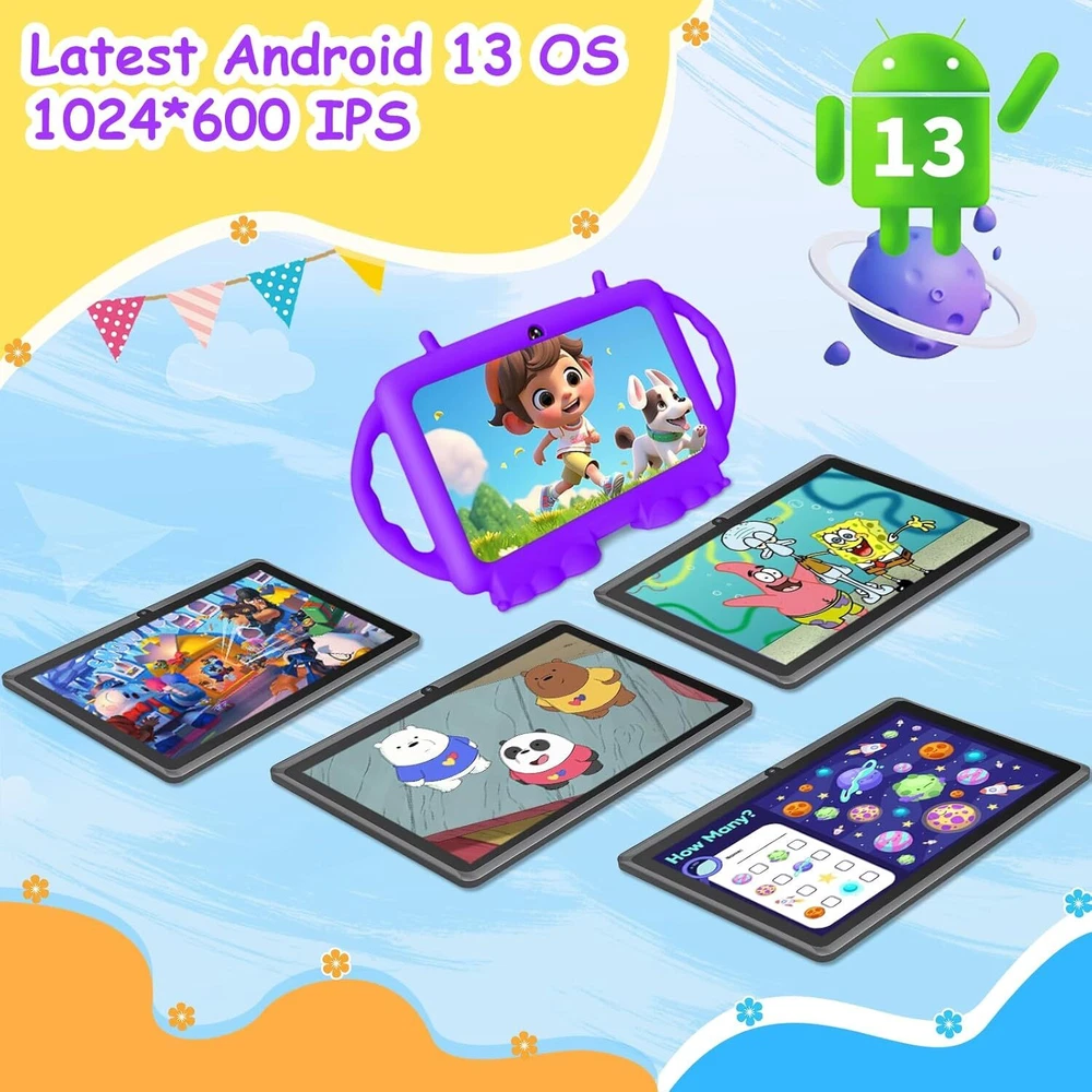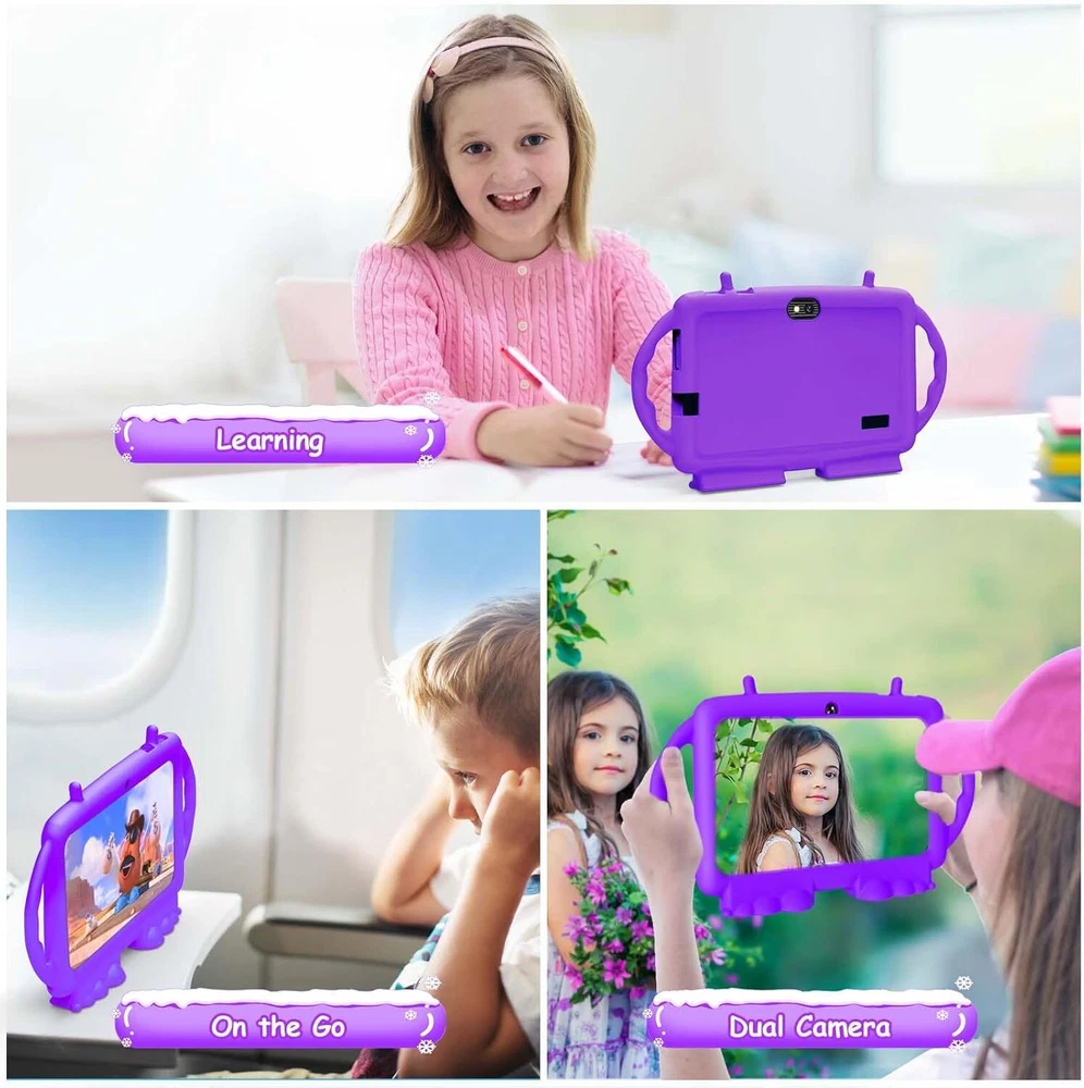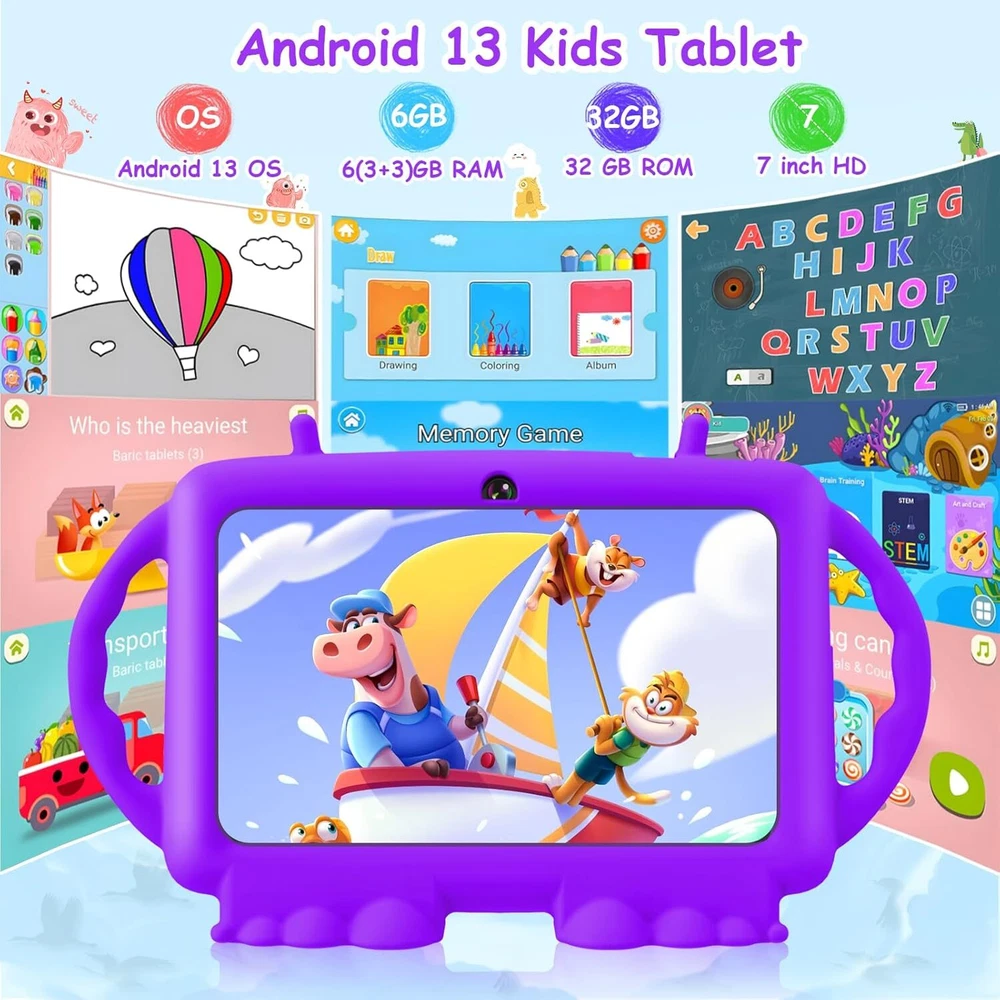 Kids Tablet, 7 inch Tablet for Kids, 6GB RAM 32GB ROM Android 13 Purple Product Details Standing screen display size: 7 Inches Screen Resolution: 1024x600 Max Screen Resolution: 1024*600 Pixels RAM: 6 GB Average Battery Life (in hours): 8 Hours Brand: Suicoey Model Name: T88 Memory Storage Capacity: 32 GB Screen Size: 7 Inches Display Resolution Maximum: 1024*600 Pixels 【Parental Control】The kids tablet is designed for kids and has a parental mode. Parents can select safe website for children, set screen time and lock the tablet to ensure that kids are exposed to safe content(Appropriate for children over 3 years old) 【Android 13 OS + Large Storage】Tablet for kids adopts Android 13 OS, which greatly improves the performance and running speed. 6(3+3virtual)GB RAM, 32GB ROM and expandable up to 128 GB via TF card offer enough space for games, movies and APPs 【Pre-installed Kids APP】The toddler tablet comes with pre-installed various kids APPs like abcmouse, Youtube Kids and Iwawa,etc. Kids can use this baby tablet for drawing, reading, calculating, watching movies, playing puzzle games and more 【Standable Case+Dual Camera】The soft silicone case protects your kid tablet against dust, bumps and drops. The tablet is also standable so child doesn't have to hold it all the time. Dual cameras help kids explore and record the world around them 【Nice Display + Upgraded Battery】The 1024*600 IPS screen delivers vivid and realistic images, while the upgraded battery extends usage time, making the 7 inch tablet a good companion for long-distance flights or road trips 【Great Choice for Children】The android 13 kids tablet allows kids to learn while playing, making it a great choice for your child. Package includes:1 x tablet, 1 x protective case, 1 x screen protector, 1 x User Manual, 1 x Type-C cable