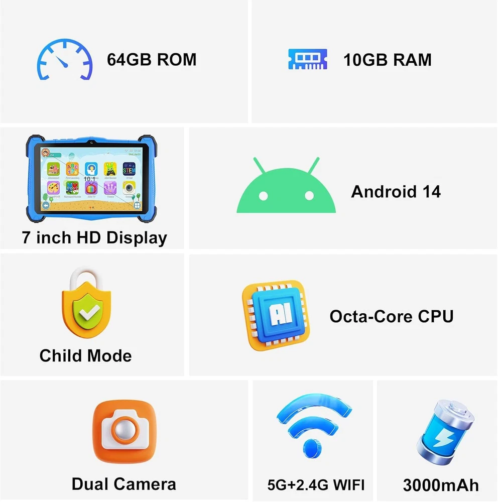 Kids Tablet 7 inch, Upgraded Android 14 for With Shockproof Blue Product Details Standing screen display size: 7 Inches Screen Resolution: 1024x600 Max Screen Resolution: 1024*600 Pixels Card Description: Integrated Brand: Fivahiva Model Name: F_764 Memory Storage Capacity: 10 GB Screen Size: 7 Inches Display Resolution Maximum: 1024*600 Pixels Powerful Performance: The Kids Tablet features an advanced Android 14 OS, powered by a robust octa-core CPU and 10GB of RAM, ensuring smooth app launches and enhanced responsiveness for an enjoyable experience for kids ages 2-14. Curated Educational Content: Preloaded with age-appropriate learning, education, and entertainment apps, our tablet for kids allows children to explore curated iWawa content, fostering creativity and knowledge in a fun, interactive way. Customizable Parental Controls: Enjoy peace of mind with our no-hassle parental controls that let you filter content based on age, set educational goals, and limit screen time, while keeping kids free from social media and in-app purchases without your approval. Seamless Connectivity: Equipped with Bluetooth 5.0 and Wi-Fi 6, this kids tablet provides fast and reliable connections for streaming educational videos, accessing online content, or connecting with family via apps like Zoom. Optimized Storage and Expandability: With 64GB of internal storage, there’s plenty of space for thousands of apps, games, and videos, making this tablet the perfect learning tool for kids ages 6-12. Effortlessly add more content as your child grows, ensuring continued engagement and discovery. Perfect Gift: Our tablet is perfect for any occasion, whether for work, study, entertainment, or productivity. Lightweight and portable, it supports touch operation and offers a variety of entertainment and educational features. The package includes a tablet, Type-C cable, charger, and user manual.