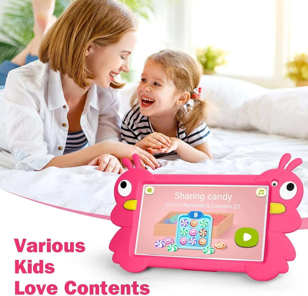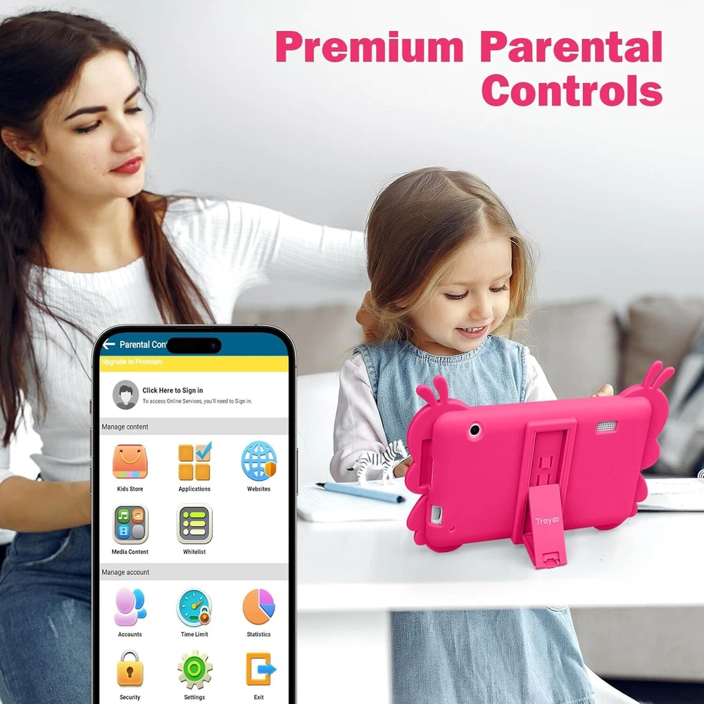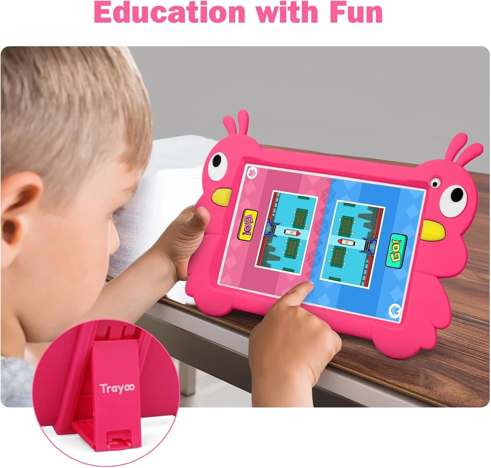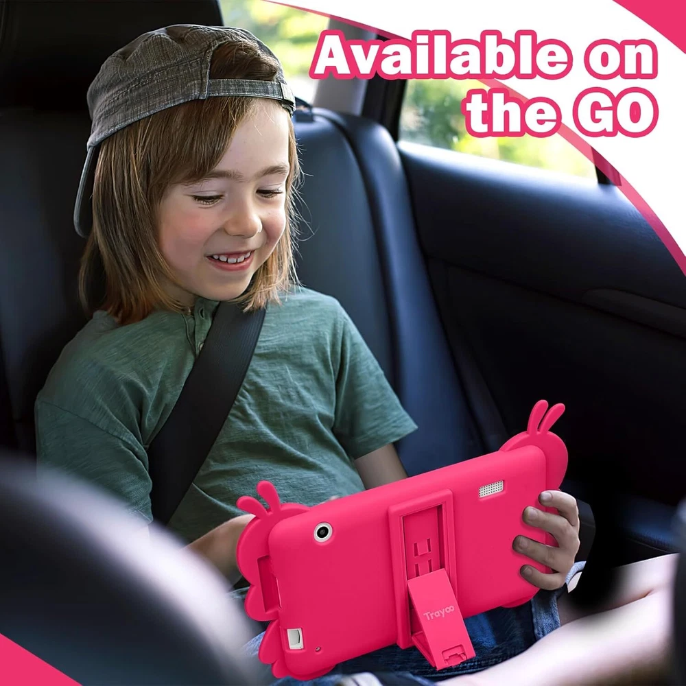 Kids Tablet 7IN Toddler for Learning, 32GB Android Roser Product Details Standing screen display size: 7 Inches Screen Resolution: 1024x600 Max Screen Resolution: 1024X600 Card Description: Integrated Wireless Type: 802.11n Average Battery Life (in hours): 8 Hours Brand: Trayoo Model Name: KIDS707A Memory Storage Capacity: 32 GB Screen Size: 7 Inches Display Resolution Maximum: 1024X600 【Entertainment Contents Kids Love】: Trayoo kids tablet for toddler comes with plenty of kids learning apps and games like Montessori, First learning, Brain Training, Mini Games, Stem, Art and Craft, Kids TV, kids art/imagination practice apps pre-loaded. Kids also can download other apps like You tube, Netflix, Disney+, Khan Academy, ABC mouse, HULU from Play store. Trayoo toddler tablet makes education fun, allowing children to acquire skills more efficiently in a shorter period of time. Good choice tablet for kids 3-7 years old. 【Easy to Use Tablet for Kids】:Trayoo have been dedicated to production of kid tablet for many years. Based on years market feedback, we designed kids learning tablet for toddlers to be with dual operate system. It only takes few minutes to set up tablet. Just power on and follow instructions on kids tablet interface to finish setting. Once finished, you can login kids mode interface. If you exit kids mode(default password is “0000”), children’s tablet will turn to a normal kids android tablet you can used for watching videos, surfing internet, reading books… One tablet designed for whole family. 【Tablet with Safety Parental Controls】:Kids safe are always the main topic of each parent, and with in mind, Trayoo designed kids tablet with case included to be with easy to operate parental controls, you can set screen time limit, educational goals, filter contents , approve app purchases and downloads, keep kids from unsafe website, or set separate profiles for different kids. Get kids tablet with shock-proof case for your little one, what you get is not just more than a peace of mind, but also safe accompany and wide range of knowledge for kids. 【Children Tablet with Shock-proof Case】:Sometimes oops happen, we designed trayoo kids edition tablet to be with a soft silicone case can helps protects children tablet against from drops, bumps, dust, dirty. Meanwhile, there is a kickstand on back kids can relax their hand while playing kids tablets. Light weight also makes toddler tablet portable for carriage. 【Good TabletSelection with Service】: Trayoo tablet for children is made for kids ages from 3 to up. Good children's tablet selection for kids ages from 3-14 years old. Trayoo kid tablet support life long technology service support. If you have any questions about tablets for kids, please let us know as soon as possible, we will give you a satisfied reply back within 24 hours.