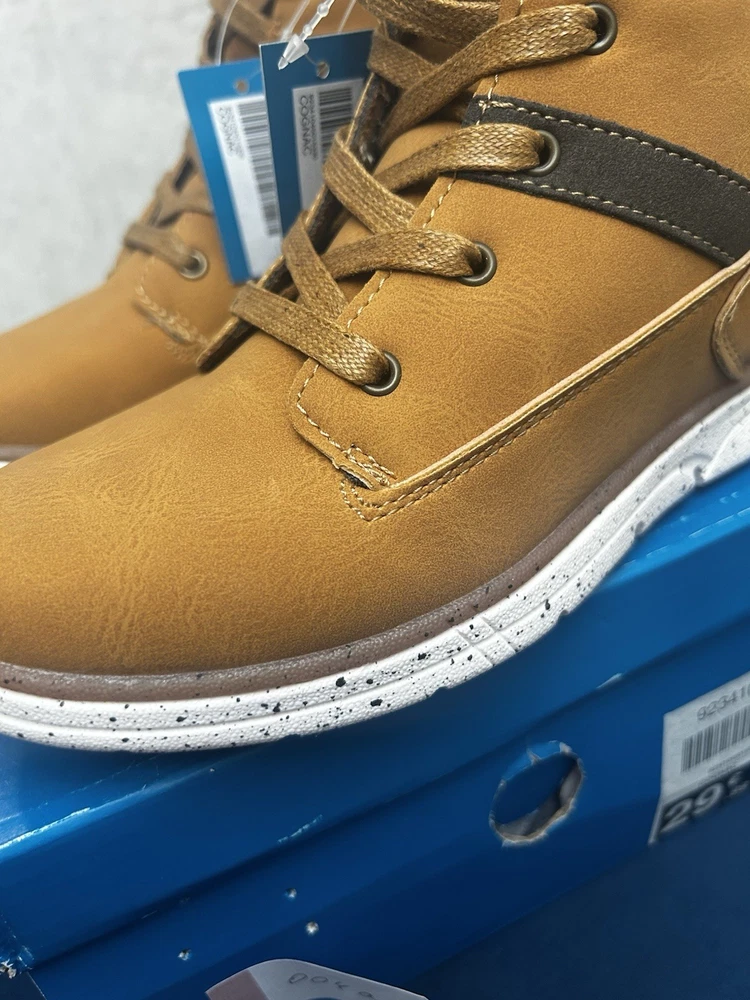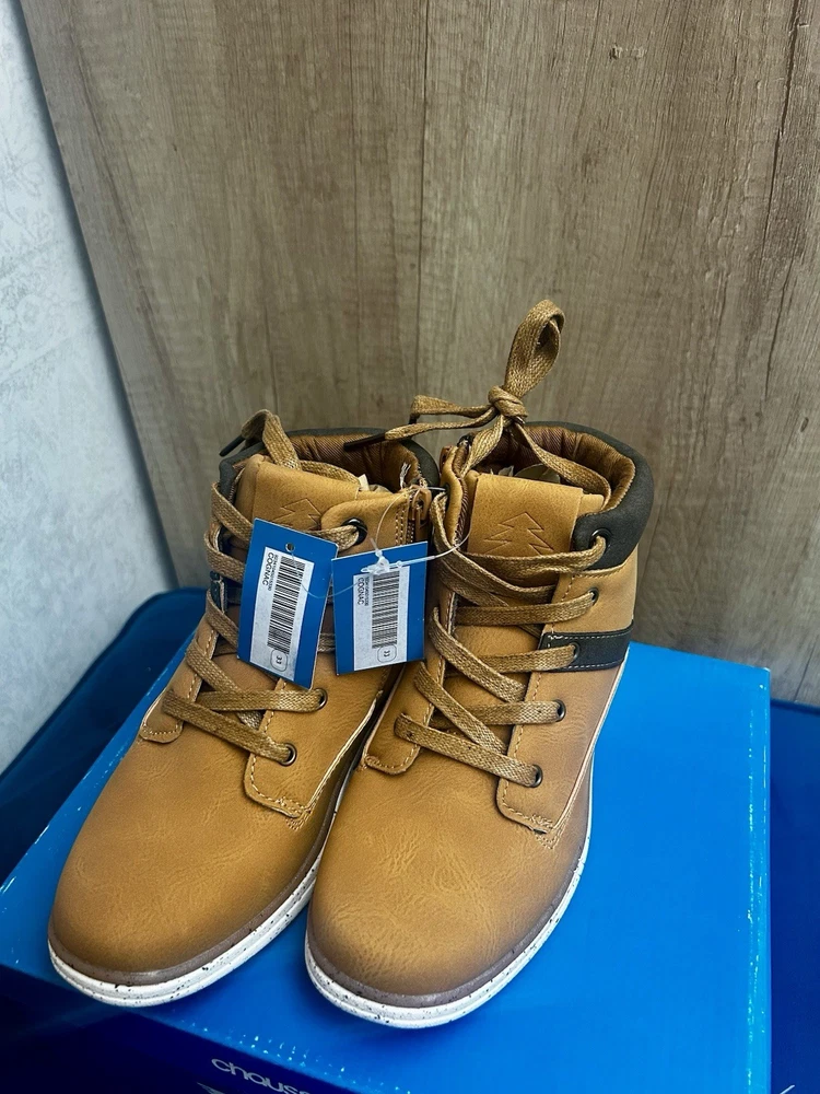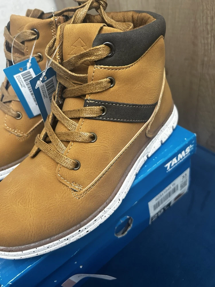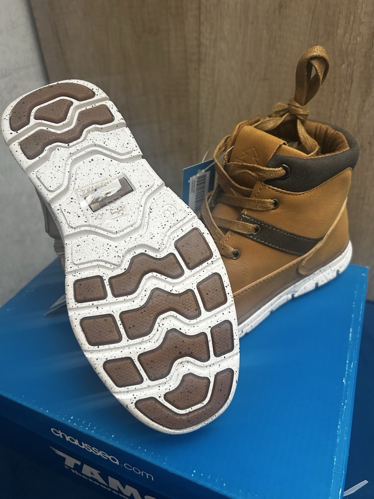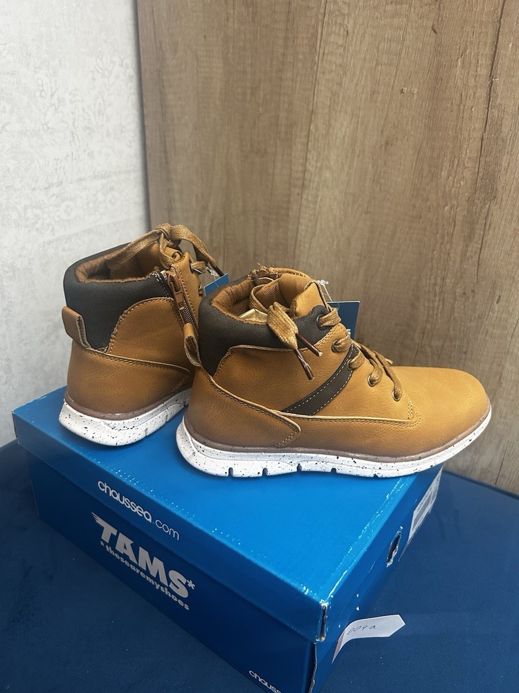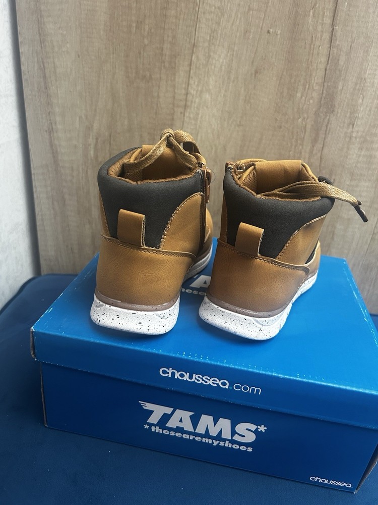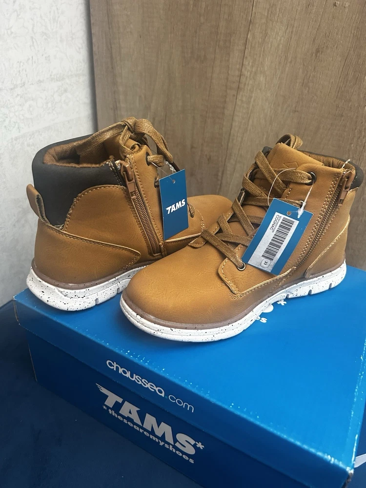 Sporty • Comfortable • Stylish Everyday Footwear Step into style and comfort with these trendy tan boot-style trainers from TAMS by Chaussea. Featuring a modern design with sporty white speckled sole, they’re the perfect mix between a boot and a sneaker – ideal for active kids who love to look good while staying comfy. ⸻ 🔥 Key Features • ✔️ Brand: TAMS – “These Are My Shoes” (Chaussea) • ✔️ Lightweight boot/trainer hybrid • ✔️ Tan synthetic leather upper with contrast dark brown cuff • ✔️ Lace-up design + side zip for easy fastening • ✔️ Flexible white speckled sporty sole with strong grip • ✔️ Cushioned interior for all-day comfort • ✔️ Brand new with tags, never worn • ✔️ Stylish stitching detail for a premium look ⸻ 👟 Ideal For ✔ Everyday wear • School • Casual outings ✔ Autumn/Winter season ✔ Kids who like a sporty but smart style ✔ Comfortable and stylish alternative to heavy boots