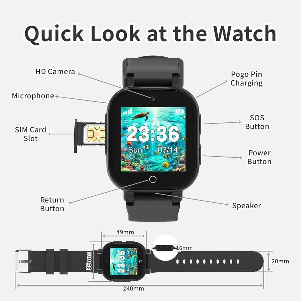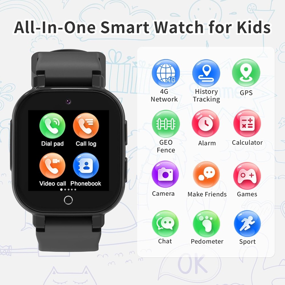 Kids Watch with GPS Tracker, for Age 5-12 Video & Black LuxeFusion Product Description Features 【All-In-One Smart Watch for Kids】 Designed with kids in mind, 4G kids smart watch with gps tracker is equipped with practical tools for kids on the go: Class & sport modes, alarms, pedometer, contacts, gallery, calculator, stopwatch, and more! It's the first perfect phone for kids ages 5+ with real calling & texting, GPS tracking, and powerful safety features. 【GPS Tracker & Safety Features】 Nibour kids smart watch boys focus on child's safety and is equipped with the best GPS positioning system include AGPS/WIFI/LBS location. Lets you check in on your child’s real-time and historical location through "JuniCare" app on your compatible smartphone, supports Android and IOS. Even receive warnings when your kid enters or leaves parent-defined boundaries. 【Real Calling & Texting】 GPS tracker watch for kids supports voice and video calls through WiFi or cellular data. Equipped with HD camera and VOLTE calling technology, provides high-quality voice and video calls. Kids cell phone watch also features texting and voice chat, securely share texts, group messaging, pictures to bring everyone closer together. 【SOS Emergency Calling】 Kids gps tracker watch features quick-dial button for emergency contacts, press SOS button about 5 seconds, kids watch boys will automatically call 3 SOS numbers in 2 rounds until answering the call and send message to the guardians. Great help for kids in emergency situation. 【Superior Performance】 Exercise is more planned with a built-in G-sensor(in three axis), automatically counts steps, distance, calories burned, and active minutes. With a longer battery life, keeping your child active all day long. Kids tracker watch supports remote monitoring with the parental control app: Only allow calls from added contacts, block incoming calls from strangers, set time limits, and more. NOTE: SIM Card need to be purchased separately and are not included in this package. It is recommended to use Speedtalk (a subsidiary of T-mobile) nano SIM Card. After the SIM card inserted, You need to restart the watch and make sure there is a 4G mark on the screen. If the watch still has no network signal, please setting up the APN. For any questions about how to set up the APN, please contact us at any time. TIPS: This kids gps watch is equipped with anti-drop screen, no need to worry about accidental falls or collisions in daily life. This greatly increases the product’s lifespan and usability. Due to the issue of network frequency bands, we recommend that the kids watch be used only in the US. Product Details Package Dimensions: 9.84 x 2.4 x 0.79 inches Item Weight: 3.2 ounces Item model number: G60 Batteries: 1 A batteries required. (included) Manufacturer: Nibour Country of Origin: China Standing screen display size: 1.43 Inches Memory Storage Capacity: 512 MB Operating System: IOS, Android Special Feature: 4G Network, GPS Tracker, One-Key SOS, Voice & Video Call, Text, Chat, Work & Sports Modes, Games, Camera, Pedometer, Alarm, Stopwatch 4G Network, GPS Tracker, One-Key SOS, Voice & Video Call, Text, Chat, Work & Sports Modes, Games, Camera, Pedometer, Alarm, Stopwatch4G Network, GPS Tracker, One-Key SOS, Voice & Video Call, Text, Chat, Work & Sports Modes, Games, Camera, Pedometer, Alarm, Stopwatch See more Battery Capacity: 700 Milliamp Hours Connectivity Technology: USB Wireless Communication Standard: 802.11bgn Battery Cell Composition: Lithium Ion GPS: Built-in GPS Shape: Square Screen Size: 1.43 Inches Free Shipping All orders ship free and fast to your doorstep. Easy Returns Satisfaction guaranteed. 30-day returns, no questions asked. 24/7 Support Contact us anytime; we’re here to help, day or night. Brought to you by LuxeFusion – Quality you can trust.