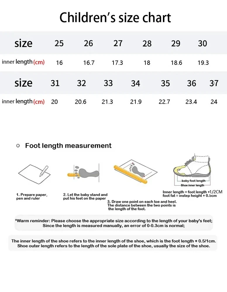 Tips 1.1. This pair of shoes is in Chinese size. Only foot length determines the correct size, so please measure your baby's foot length before ordering. 2. For children whose feet are not fully developed, we reserve 1-2 cm of toe space between the recommended foot length and inner length. 3. If your baby's feet are wider or fatter than usual, we recommend you buy one size larger. Size 25 = inner length 16.0 cm = suitable for feet 14.0~15.0CM Size 26 = inner length 16.7 cm = suitable for feet 14.7~15.7CM Size 27 = inner length 17.3 cm = suitable for feet 15.3~16.3CM Size 28 = inner length 18.0 cm = suitable for feet 16.0~17.0CM Size 29 = inner length 18.6 cm = suitable for feet 16.6~17.6CM Size 30 = inner length 19.3 cm = suitable for feet 17.3~18.3CM Size 31 = inner length 20.0 cm = suitable for feet 18.0~19.0CM Size 32 = inner length 20.6 cm = suitable for feet 18.6~19.6CM Size 33 = inner length 21.3 cm = suitable for feet 19.3~20.3CM Size 34 = inner length 21.9 cm = suitable for feet 19.9~20.9CM Size 35 = inner length 22.7 cm = suitable for feet 20.7~21.7CM Size 36 = inner length 23.4 cm = suitable for feet 21.4~22.4CM Size 37 = inner length 24.0 cm = suitable for foot length 22.0~23.0CM