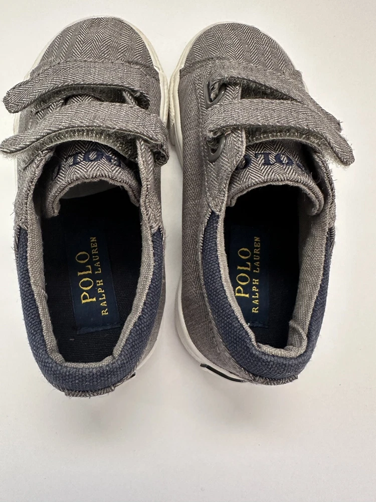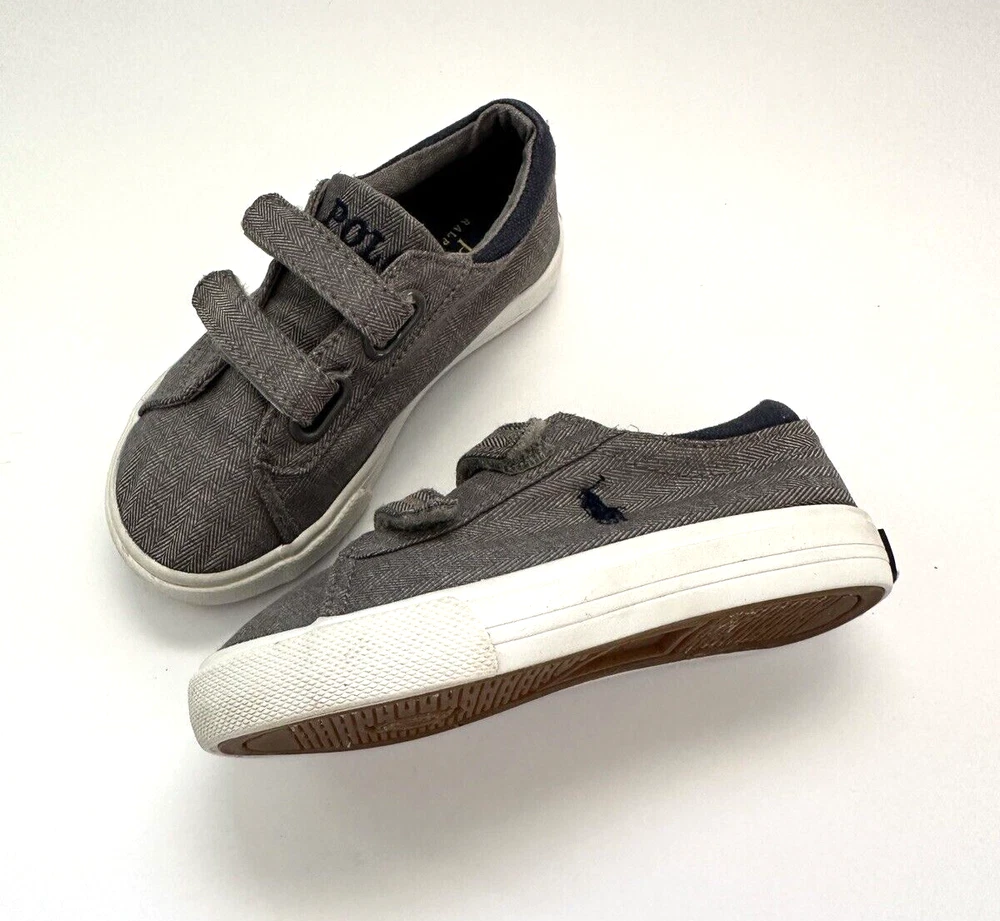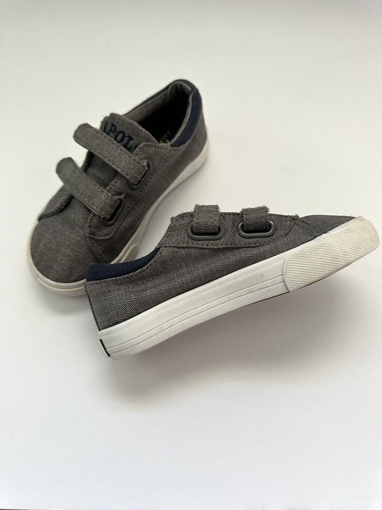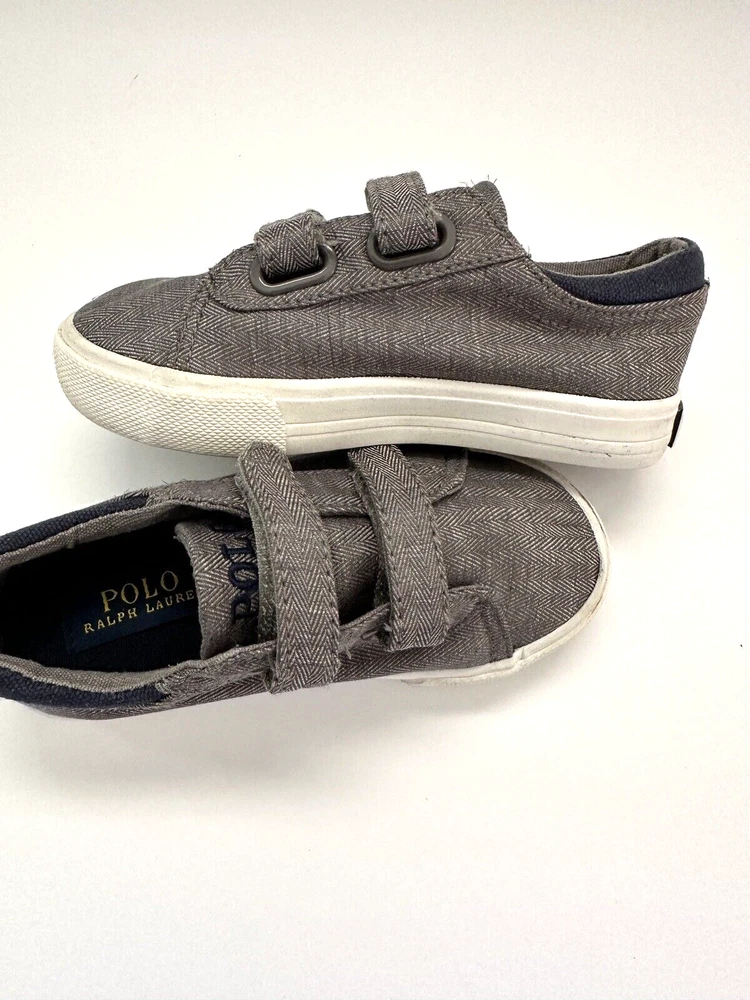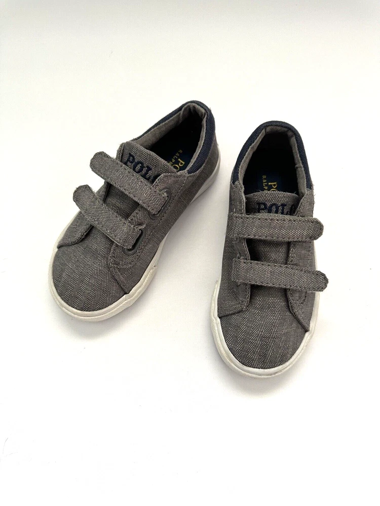 Department:Unisex KidsUS Shoe Size:8Brand:Ralph Laurengtin13:Does not applyColor:GrayRare:Hard To FindUPC:Does not applyFabric Type:CanvasType:AthleticStyle:SneakerUpper Material:CanvasShoe Width:MSeller Notes:“gently worn condition- a few tiny black marks on the whit part of the sole”Features & Fastening:hook & loopOccasion:CasualCountry/Region of Manufacture:China