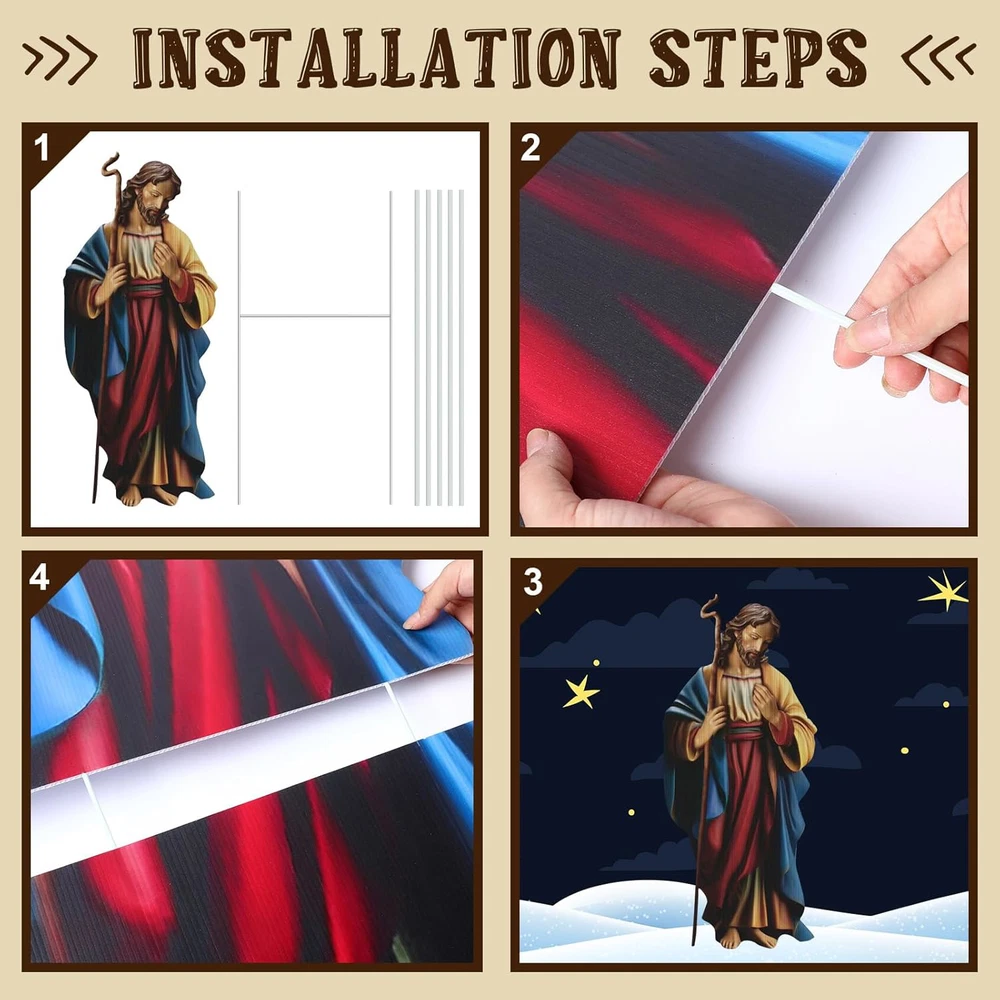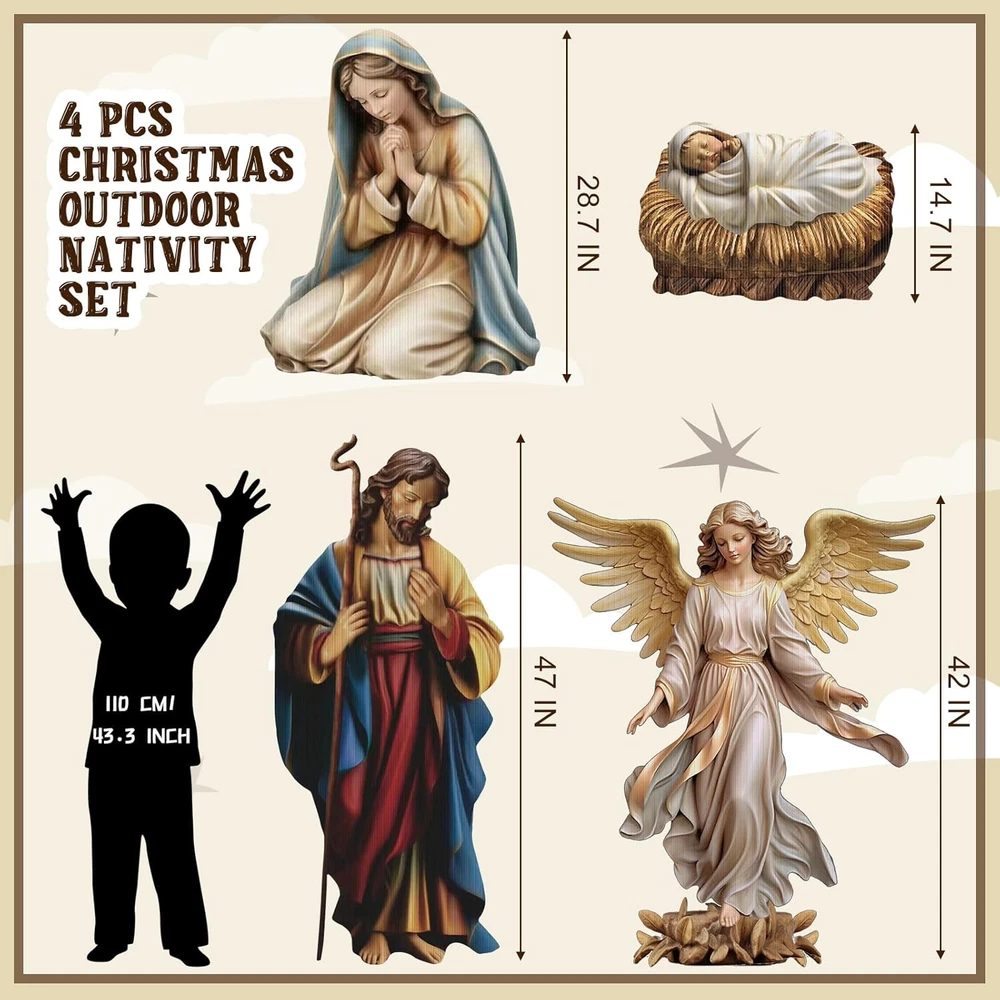 Sufficient Quantity to Use: experience a complete and beautiful display with our Christmas yard signs, as each package includes 4 sets of nativity, 8 stakes, the patterns are realistic and bright, helping you show your religious beliefs and support; This generous quantity ensures that the corners of your outdoor space can be covered, providing a well rounded and robust aesthetic effect Diverse Size to Decorate: our Christmas decorations outdoor yard come in various sizes, about 40 inches, 47 inches, and 28.7 inches in height respectively; This variety in size creates a beautiful tiers effect when displayed together, enhancing the space they are applied in, big or small Reliable Material to Support Your Usage: with Christmas outdoor yard signs stakes made from corrugated plastic cardboard signs and metal stakes, our outdoor nativity sets are not just visually pleasing but also highly sturdy, printed with sunscreen paint, waterproof and weatherproof, these strong and solid materials ensure the longevity of our product and enhance its performance even in outdoor conditions Easy to Install and Use: our Christmas yard stakes, each coming with 2 metal stakes, about 42.3 oz in weight, allow for easy installation, just need to insert them in the ground, simple yet secure, whether you are setting up for the holiday season or a religious occasion, our nativity sets are easy to use Extensively Applicable to Occasions: whether you are celebrating Christmas, Easter, or looking for an attractive year round landscape addition, our Xmas outdoor nativity sets are fitting for diverse occasions, including anniversaries, weddings, baptisms, baby showers and more; Their neutral colors blend seamlessly with different settings and themes Features: If you are looking for ideal presents that are both pleasing to look at and functional, our nativity outdoor Christmas decorations are nice choices. Their quality design and appealing aesthetic make these charming gifts for Christians, family, partners, or neighbors. Apart from their aesthetic function and religious symbolism, our Xmas Jesus birth manger scene supplies also serve practical purposes. The exquisite design means they can be applied as blocks against the wind for light decoration pieces, or applied as attractive dividers to mark boundaries in your garden. Specifications: Material: Sign: corrugated plastic cardboard Stake: metal Color: as pictures shown Sign size: respectively about 40 inches, 47 inches, 28.7 inches in height Stake weight: about 42.3 oz Package includes: 4 x Outdoor nativity sets 8 x Stakes Notes: Manual measurement, please allow slight errors on size. The color may exist a slight difference due to different screen displays. Pointed items are included, please keep away from little kids.