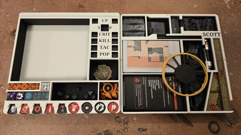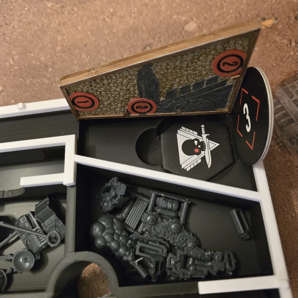 This item is perfect for any Kill Team player that wants to only take one box that carries everything they need. This will fit inside the 4L Really Useful Box so that you use the remaining space for your Kill Team whilst the box will house everything else needed to play a game, with the exception of the terrain. This box will fit all the tokens that are come bundled with the Kill Team Starter Set as well as all the equipment in the Kill Team Equipment upgrade pack. The bottom has two slots that fit tarot sized kill team cards. Both with and without sleeves. There is also a circle cut out for large custom objective markers. There are several extra spaces for whatever else you may wish to include. I also include a removable card divider if you wish to fit more cards in the dice tray. It may also fit in other boxes that are designed for A4 paper but please check the below dimensions of the box with the Support bar that stops the box from sliding. Box - L:215 W:220 H:65 Box with Support Bar - L:215 W:348 H:65 The support bar will come in two pieces that you will need to push together, then slide into the opposite corners of your Really Useful Box. This does not come with any items that are inside the token box. The current items in there are for display purposes to show what goes in. You will also need to obtain your own Really Useful Box, preferably with ferrous sheets, so your models can use magnets to stick in the box. I do not recommend magnetic sheets as they do not generate a strong pull for other magnets, where ferrous sheets do even though they aren't magnetic themselves. This box is 3D printed, and small visual imperfections may occur with your print. Please make sure to thoroughly test your the printed box in your Really Useful box with the U bar to make sure it doesn't slide before you put any models in.