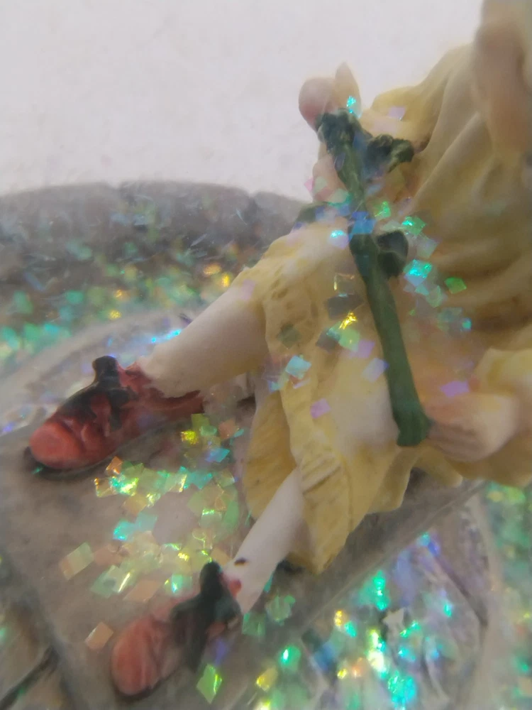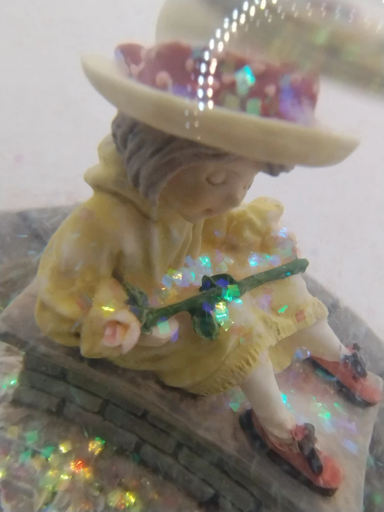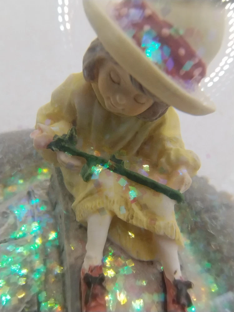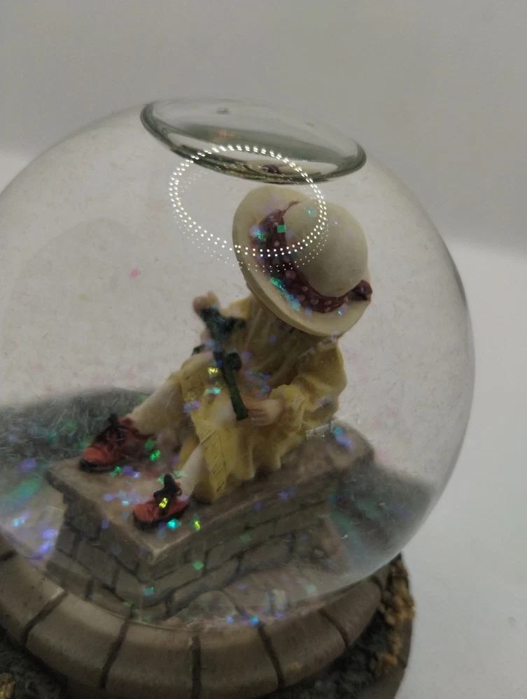This handcrafted snow globe features a round shape with a small size, measuring 4.25 inches in length and 3 inches in width. It contains water as the fill material and is adorned with crystals, giving it a romantic and nostalgic feel reminiscent of the 1970s era. The globe showcases a scene of a girl in a snow-covered setting, part of the "Forever Young" collection by Kim Anderson. This licensed reproduction from Westland Giftware is a charming piece that captures a sense of innocence and youthfulness.
