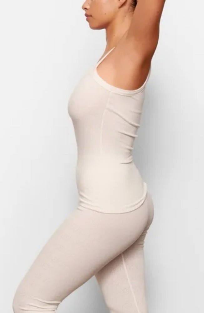 Kim Kardashian SKIMS Logo Strappy Tank, Bone Small This strappy tank top, featuring the iconic Kim Kardashian SKIMS logo, is a must-have for any fashion-forward woman. Made with a blend of spandex and cotton, this top is both comfortable and stylish. It comes in a beautiful bone color and is available in a size small, perfect for those who want to show off their curves. The tank top is designed with straps and a flattering cut, making it a must have. So get ready to turn heads with this stunning top from Kim Kardashian SKIMS! Logo Pointelle Strappy Tank | Bone— Part of the Logo Pointelle collection. Pretty in pointelle! This delicate scoop neck tank top features a form fitting design and subtle SKIMS logos stitched into the fabric. Terms of Sale/Refund: Please return all items unused with all original tags (if received that way). deductions will also be applied on items returned that have obvious wear for example: deodorant stains, stretched, smells. Shipping: NOTE: Items will only be delivered to the address you checked out with. In the event you need to correct your address after purchase; The order will have to be canceled and repurchased with corrected address. Sizing The size chart on the listing is a reference guide only. Please research the size you need prior to purchase as certain SKIMS pieces differ in sizes. For most Shapewear if you are in between sizes it is recommended to SIZE UP. PLEASE READ-let me know if you need more pictures or have any questions before you purchase. Please research the color and the item you are looking for sometimes the pictures are a little different but I can take extra pictures if I need to.
