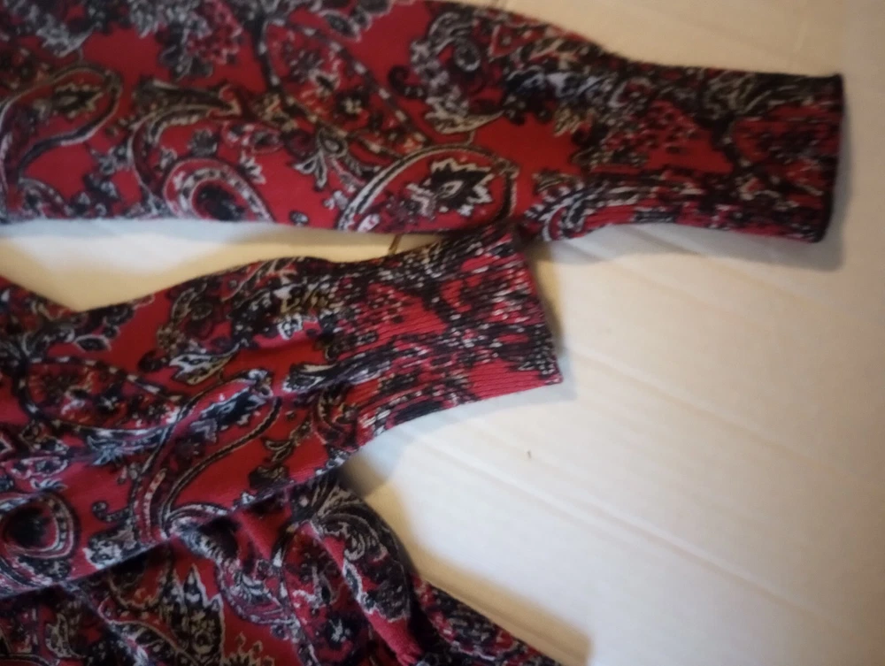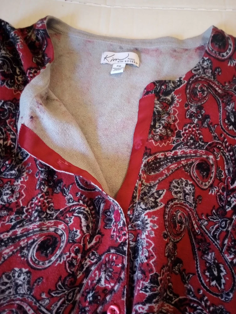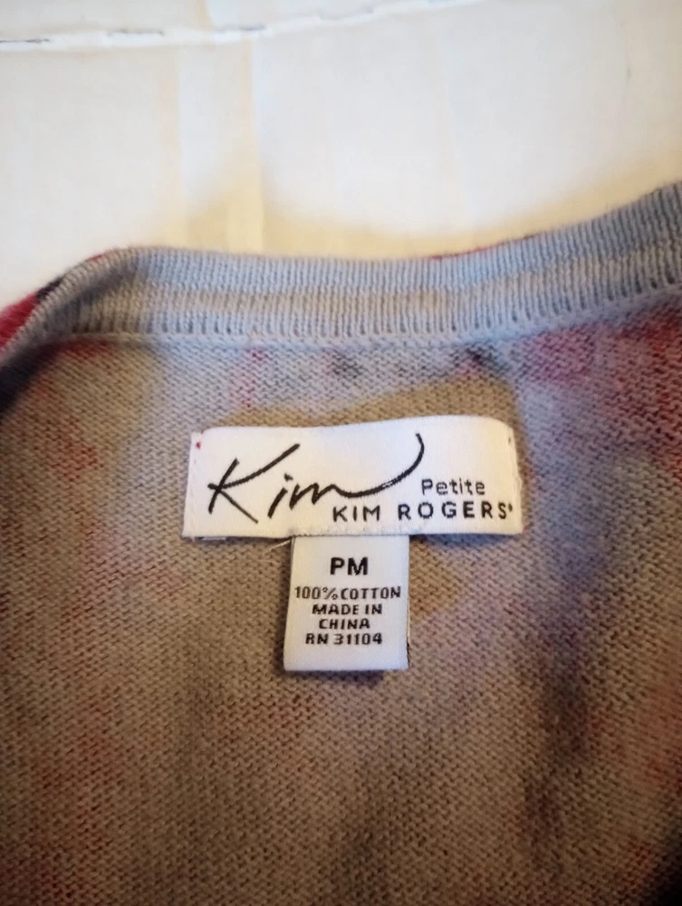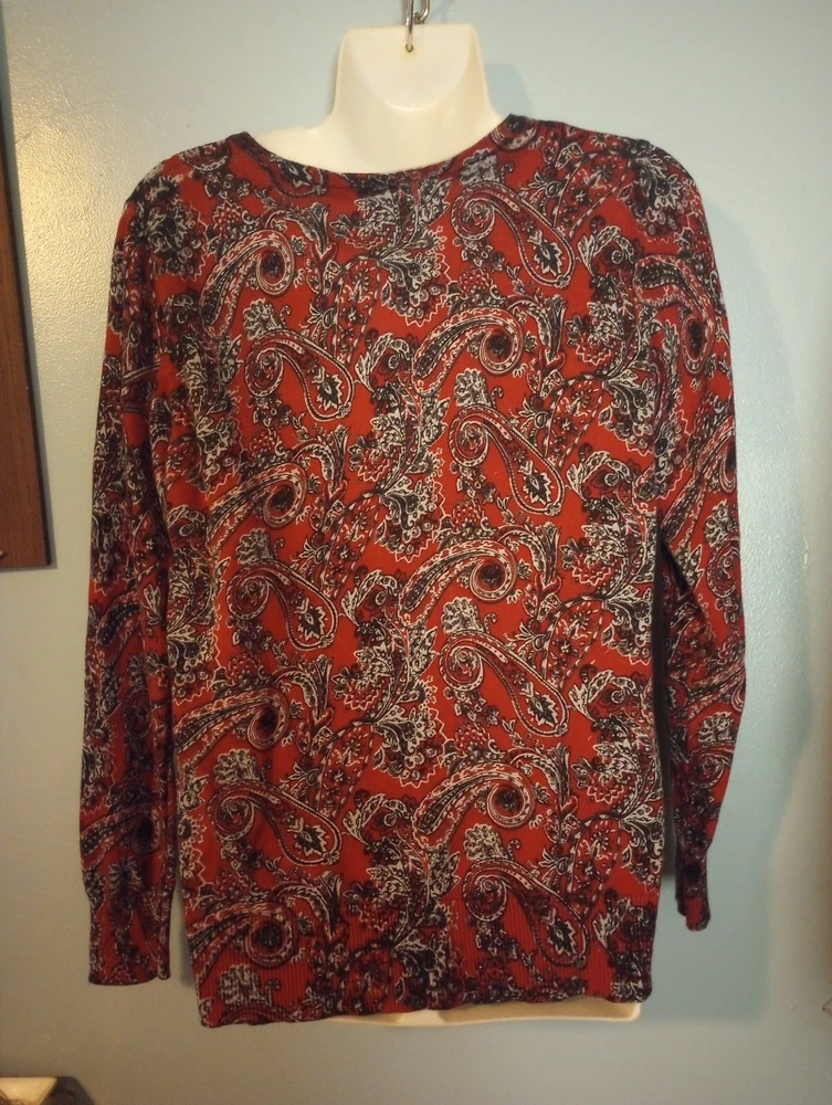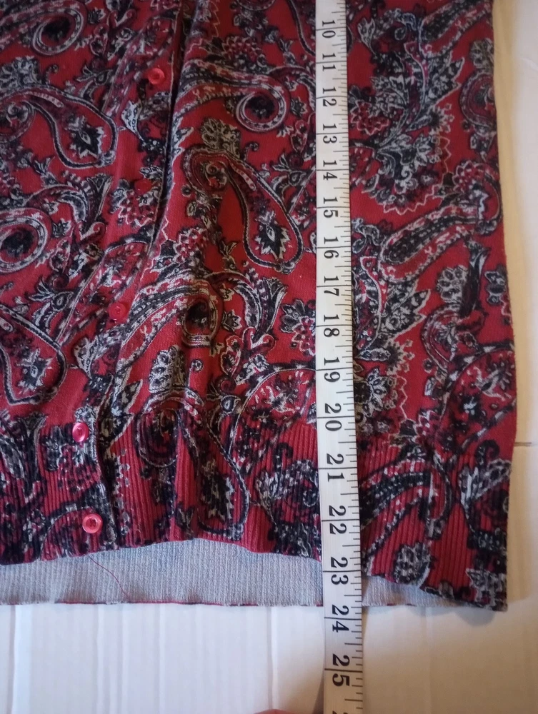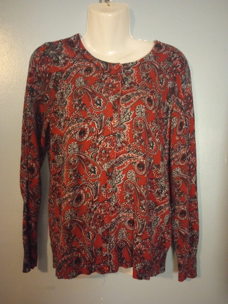 like new button front sweater from Kim Rodgers size large maroon, gray, black measurements in photos