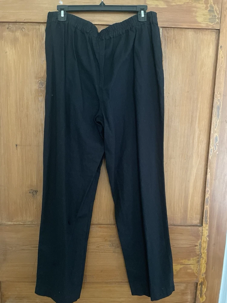 Kim Rogers black pants. Size medium. Flat front. Drawstring waist with elastic. Front pockets. Straight leg. Cotton linen blend. Machine wash. Excellent condition. Waist 35 inches Stride 11.5 inches Inseam 30 inches