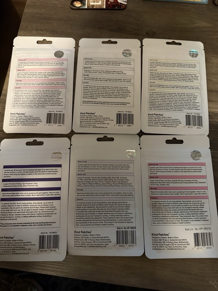 Kind Patches Wellness Variety Pack (6 Types) - Natural, Vegan, Easy-to-Use Description: Transform your daily wellness routine with this complete variety pack of Kind Patches, featuring six specialized formulas designed to support your body naturally and effectively. These innovative transdermal patches deliver ingredients steadily through the skin, bypassing the digestive system for enhanced absorption and a more consistent effect than traditional pills or supplements. Why You'll Love Kind Patches: Effortless Application: Simply peel and stick a patch on a clean, hair-free area of skin. Wear for up to 8 hours for continuous support. Pure & Potent Formulas: Made with natural, plant-based ingredients, all patches are vegan, cruelty-free, and free from fillers, latex, lactose, gluten, and sugar. Targeted Relief: Each patch is specifically formulated to address different wellness needs, helping you feel your best every day. What's Included: Menopause Patches (30ct): Support hormone balance, help alleviate symptoms like headaches and hot flashes, and improve mood stability with a blend of Selenium, Curcumin, and Dong Quai Root. Dream Patches (30ct): Promote deep relaxation and enhanced sleep quality without morning grogginess using Magnesium, Ashwagandha, and Valerian Root. Energy Patches (30ct): Combat fatigue, enhance alertness, and sharpen focus with a blend of B vitamins, Caffeine, and Red Ginseng. Mojo Patches (30ct): Reignite your natural drive, energy, and confidence by supporting healthy hormonal balance with Tongkat Ali, Zinc, and Pomegranate extract. Boost Patches (30ct): Fortify your immune system and overall vitality with essential multivitamins, including Iron, Magnesium, and Vitamins A, C, and B complex. Period Patches (14ct): Ease discomfort and muscle tension during your cycle with a soothing blend of Menthol, Camphor, Ginger, and Chamomile essential oils. Condition: New, in original sealed packaging. Discover the convenience and effectiveness of transdermal wellness solutions.