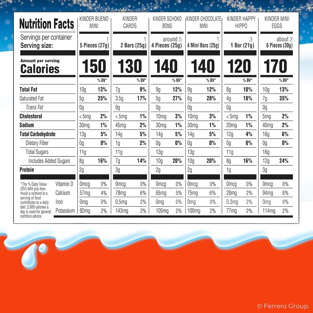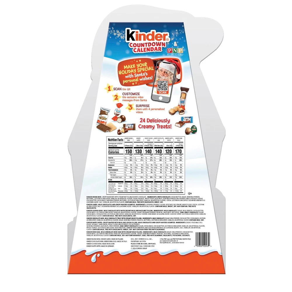 Kinder Holiday 2024 Advent Calendar, 24 Individually Wrapped Pieces, Blue Product Details Product Dimensions : 11.06 x 1.18 x 19.09 inches; 7.16 ounces UPC : 009800520299 Manufacturer : Ferrero Brand: Kinder Joy Color: Blue Theme: Christmas Age Range (Description): Kid Format: Advent Calendar KINDER HOLIDAY MIX COUNTDOWN CALENDAR: Share the magic of the holidays with this 24-piece Kinder Holiday 2024 Advent Calendar—this 6.9-ounce box makes the perfect holiday gift for all this season HOLIDAY COUNTDOWN: Count down to the holidays with seasonal graphics on a holiday house with 24 windows, each containing a different crispy or creamy Kinder holiday chocolate treat. CHOCOLATE GIFT: Discover assorted, individually wrapped Kinder milk chocolate and crispy wafer treats: Kinder Happy Hippo, Kinder Bueno Minis, Kinder Chocolate Minis, Kinder Schokobons, Kinder Cards and Kinder Chocolate Mini Eggs PERSONAL MESSAGE FROM SANTA: Create even more magical memories this season with the Portable North Pole app. Parents can send personalized messages from Santa to their children all season long SO MANY TREATS: Try our wide variety of delicious chocolatey treats. Made with no artificial colors or preservatives. Count down to the holidays with a seasonal exclusive assortment of 24 delicious Kinder holiday chocolates. A great holiday gift, the 2024 Kinder Holiday Mix Countdown Calendar is filled with Kinder Happy Hippo, Kinder Bueno Minis, Kinder Chocolate Minis, Kinder Schokobons, Kinder Cards and Kinder Chocolate Mini Eggs. Kinder Bueno Minis are a smooth milk chocolate with a dark chocolate drizzle covering a crispy wafer with a creamy hazelnut filling. The Kinder Card features 2 crispy wafers with a delicious creamy milky filling. Kinder Schokobons are smooth milk chocolate with a creamy milk and hazelnut filling with bits of hazelnut. Kinder Chocolate Minis are milk chocolate with a delicious, creamy, milky filling. Kinder Happy Hippos is a crispy wafer with a milk and cocoa filling. While, Kinder Mini Eggs have a smooth milk chocolate and creamy milk filling. Have an enjoyable holiday countdown with a sweet treat every day in December. This advent calendar for kids will bring the joy of the season to life. Parents love Kinder treats because there are no artificial colors or preservatives used. Plus, add even more magic to the season with the Portable North Pole app that lets parents create and send personalized messages from Santa to their children all season long.