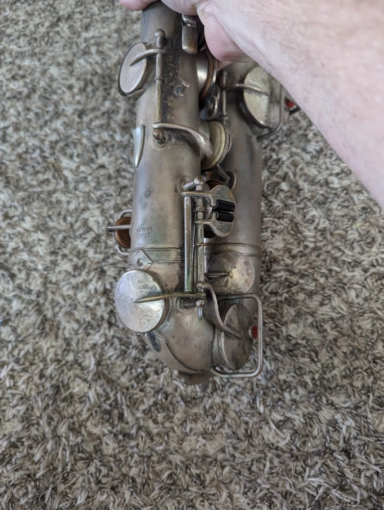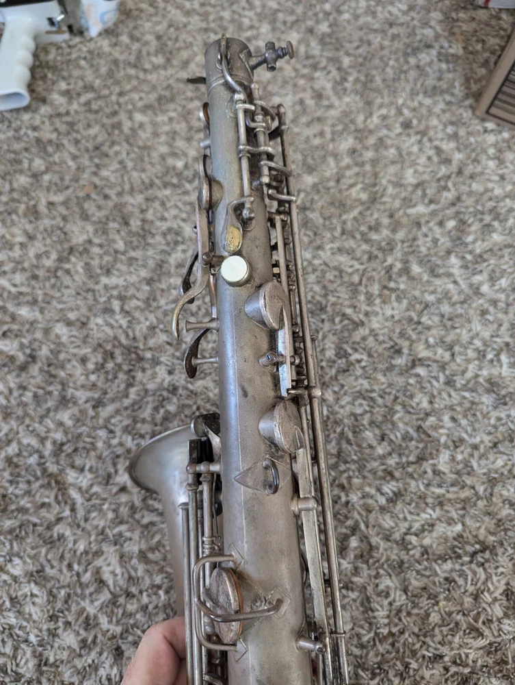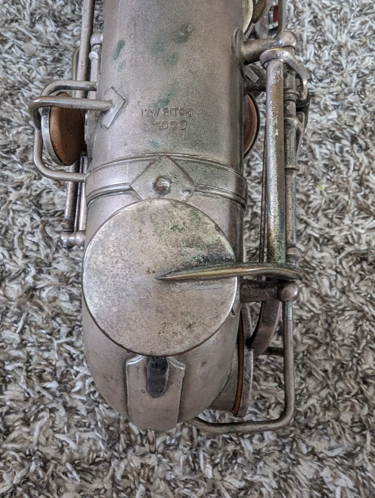 King C Melody Saxophone Silver Plated Body Only For Parts 37079 w/detached right hand palm key on offer (see photos). All keys actuate but the horn has not been tested for stuck rods or screws. The low Eb key guard and half of the right-hand thumb rest are not present (again, see photos for details). Plating coverage is good overall and there's not a ton of obvious dings/dents. Thanks for looking.