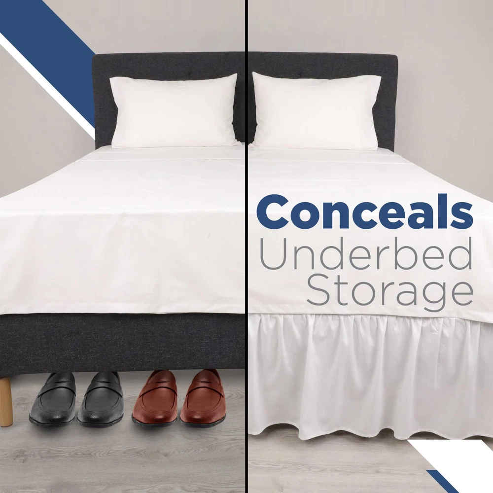 Experience refined elegance and the ultimate bedroom upgrade with a beautiful bed with the Basic Microfiber King Bed Skirt. It adds a soft silhouette to your room with its refined ruffles and its gathered top gives it a luxurious look. Offering cool and classic hues, there’s a color that coordinates with every bedroom and our wide range of bed linens. A great way to conceal unsightly box springs, bed frames, and storage under the bed, the Basic Microfiber Bed Skirt also reduces under-bed dust. It’s made from -resistant, 100-percent brushed Polyester microfiber, meaning it maintains a soft look and feel while being machine washable and dryer safe. It features a 15-inch drop on three sides and a durable, 100-percent Olefin platform to keep it securely in place for a perfect fit. And it’s OEKO-TEX certified, so you’ll sleep with peace of mind knowing the Basic Microfiber Bed Skirt was made without the use of harmful chemicals. Machine wash cold on gentle cycle with similar colors. Use only non-chlorine bleach when needed. Tumble dry low. Do not iron platform. Features a 15-inch drop made of 100-percent Polyester microfiber; 100-percent Olefin platform Soft silhouette undulates with romantic ruffles Brushed for a soft look and resistant. Available in navy, gray, black, and white Machine washable and dryer safe Twin 39-inch W x 75-inch L x 15-inch H Full 54-inch W x 75-inch L x 15-inch H Queen 60-inch W x 80-inch L x 15-inch H King 78-inch W x 80-inch L x 15-inch H. TRANSFORM YOUR SPACE: Add some thrilling frill to your bedroom decor with this ruffle bed skirt. The ruffle bedding adds a sense of rejuvenated style to any space. This king size bed skirt measures 78” x 80” with a 15” drop. STYLISH HIDEAWAY: Storing your things under the bed doesn’t have to be a battle. Hide away the mess with a wrap around bed skirt. Bedskirts fit well under your mattress to keep it in place and add secret storage under your bed. VERSATILITY: A ruffled bedskirt that can be used to up the style, hide unsightly bed legs, or your mess. It comes in different colors and sizes that are bound to fit any decor style, adding a touch of elegance. It is OEKO-TEX STANDARD 100 certified. DURABLE LUXURY: Take your room from plain to polished with this white bed skirt. It is made from 100% brushed microfiber for an extra touch of softness. The flowing silhouette of this bed frame cover is a perfect addition to any bedding. EASY CARE: Machine washable, so you can spend more time relaxing and less time fussing. This bed ruffle makes dressing your bed effortless and easy to maintain. This long bed skirt is made with both style and convenience in mind.