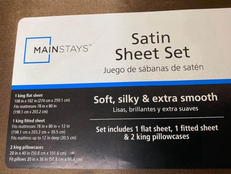 Mainstays King Satin Sheet Set Brown For sale is this Mainstays King Size set There are two sticker stains on the front cover as seen in photos but it is just a satin case that holds the sheets them self This set is BRAND NEW! Includes 1 king flat sheet 108 in x 102 in (274 cm x 259.1 cm) Fits mattresses 78 in x 80 in (198.1 cm x 203.2 cm) 1 king fitted sheet Fits mattresses 78 in x 80 in + 12 in (198.1 cm x 203.2 cm + 30.5 cm) Fits mattress up to 12 in deep (30.5 cm) 2 king pillowcases 20 in x 40 in (50.8 cm x 101.6 cm) Fit pillows 20 in x 36 in (50.8 cm x 91.4 cm) Brand new Any questions please ask