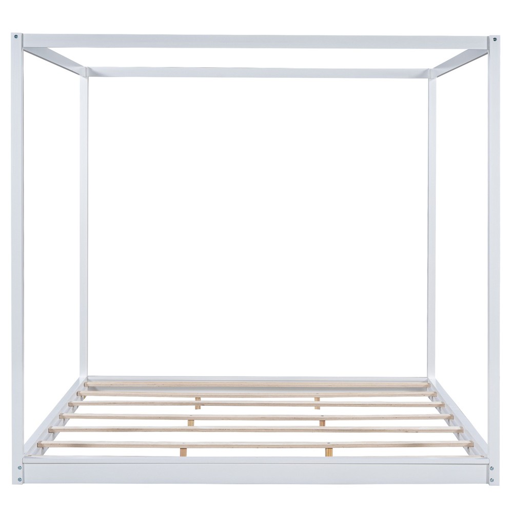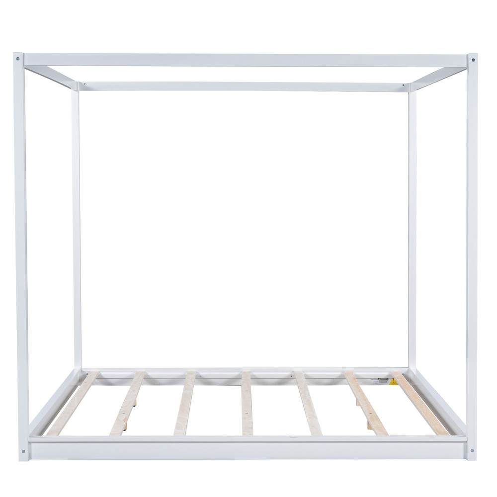 King Size Canopy Platform Bed with Support Legs and 8 Support Slats White Features [Keep Fresh] Despite the low base, the bed slats do not touch the ground, allowing the underbed space cool and ensure your mattress stays fresher for longer. [High Quality] Designed with a clean silhouette, this eye-catching piece is crafted in sturdy pine wood and MDF that is stable and durable. [Modern Design] Canopy bed is an eye-catching single product, using modern design, is the perfect center of your bedroom. [Canopy Design] The stylish silhouette of the frame includes sturdy slats with guide rails at the top, which can be customized using decorative curtains. [Easy Assembly] All parts, tools and instructions are shipped straight to your door in one efficiently packed box for simple set-up that takes less than an hour with a friend's help. Description King Size Canopy Platform Bed with Support Legs, White When choosing a bed ,this bed meets your all requirements. Designed with a clean silhouette, this eye-catching piece is crafted in sturdy pine wood and MDF that is stable and durable.The slat base is designed to allow air to pass freely beneath your bed, which will keep the underbed space cool and ensure your mattress stays fresher for longer! No bed base or box spring required.And the support legs offer extra support. Simply add your favorite bed mattress, some luxury bedding, and even canopy bed curtains to create a distinct look that's all your own. Description Material Pine Wood+MDF Size King Color White Numbers of Package 1 Spring Box No Need Assembly Required Yes Dimensions Overall Product Dimension 83.9''L*76.2''W*74.8''H Bed Dimension 80.3''x 76.2'' Total Height 74.8'' Number of slats 8pcs Overall Product Weight 77.5lbs Bed Weight Capability 700lbs Recommend Mattress Thickness 8-10''