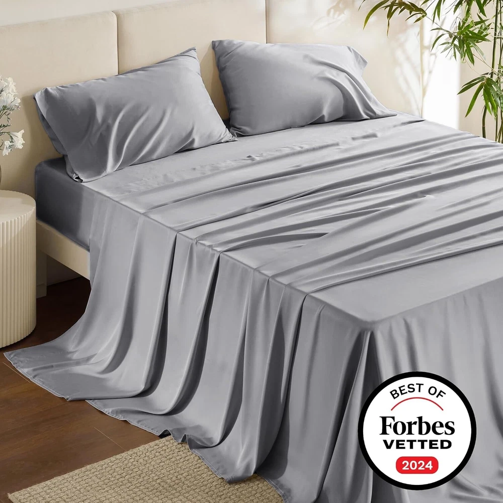 King Size Sheet Set, Cooling Sheets King, Rayon Derived from Bamboo, Deep Pocket Up to 16", Breathable & Soft Bed Sheets, Hotel Luxury Silky Bedding Sheets & Pillowcases, Silver Grey Silky Soft: King Sheet Set are made from rayon derived from bamboo with a unique twill weave, making it stronger than cotton and smooth like silk. Sleep like you're on a cloud with our comfy bed sheets. Cool & Dry All Night: Experience the ultimate comfort and luxury with these sheets set. Made from rayon derived from bamboo, these cooling sheets are moisture-wicking, breathable, and thermoregulating, keeping you refreshed all round. Deep Pocket & Easy Fit: A deep pocket fitted sheet is included in the set and fits mattresses up to 16 inches thick. The elastic band around the edge ensures a secure fit that won't shift while you sleep. The included silky-smooth envelope closure pillowcases reduce friction on your hair, keeping your locks smooth and healthy. Easy to Care: These chill sheets are OEKO-TEX Standard 100 certified for high safety standards. Simply machine wash them in cold water on a gentle cycle for a like-new restoration, do not use bleach and fabric softener. What You Get: This Bedsheets for King Size Bed includes two pillowcases (20" x 40"), a flat sheet (108" x 102"), and a fitted sheet (78" x 80").