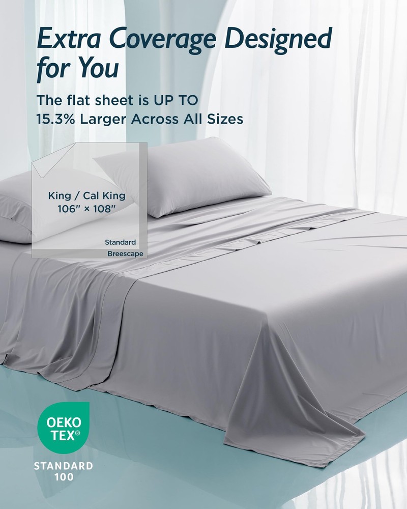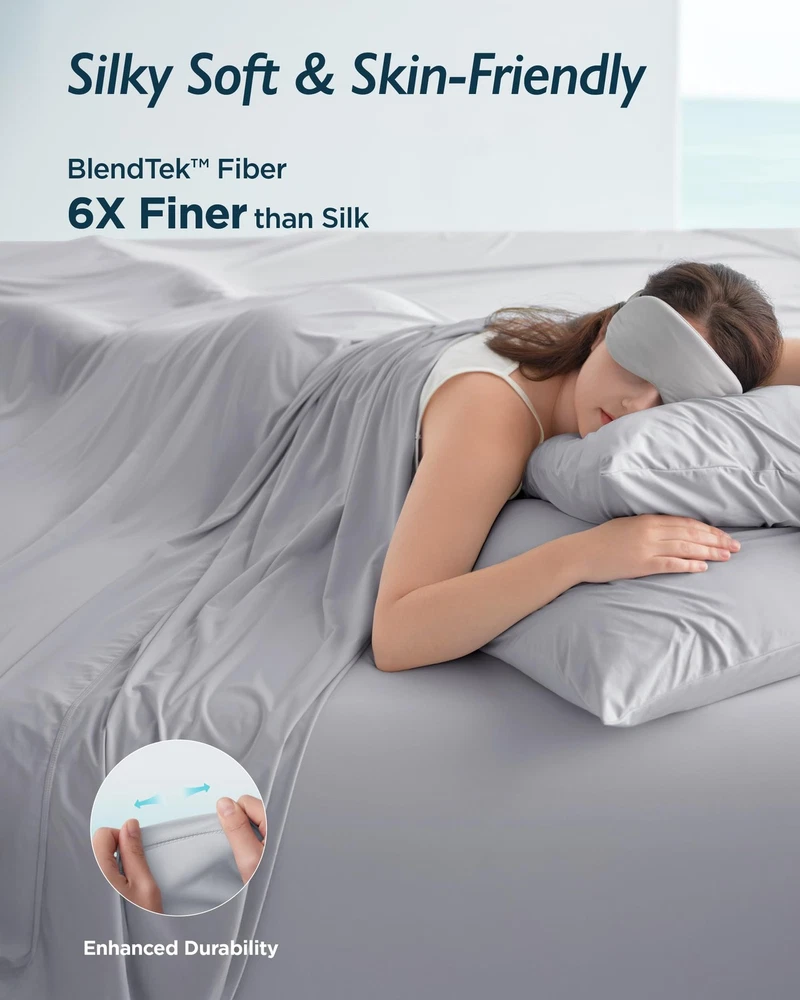 Cooling Sheet Sets for Hot Sleeper What You Get: This sheet set includes 1 flat sheet (106" x 108"), 1 fitted sheet (77" x 77"), 2 pillowcases (20" x 36"), the flat sheet offers up to 15.3% more coverage to standard flat sheet, draping nicely to gently hug your body for all-around comfort. Whole-Night Cooling: Start experiencing breezier nights with our cooling sheet set. Crafted with our innovative BlendTek fiber, it’s 3.1x cooler than bamboo rayon, 4.5x more breathable than cotton, and 1.5x more moisture-absorbent. Plus, with a Q-Max value of 0.46, it ensures you're sleeping on fabric that's instantly cool to the touch and stays that way all night. Temperature & Moisture Control: Our cooling bed sheets for hot sleepers are created with a unique polygonal fiber structure that's optimal for wicking away moisture, paired with breathable fiber gaps that enhance airflow. This combination helps heat and moisture escape quickly, keeping you comfortable throughout the night. Thoughtful Details: Every sheet set comes with deep pockets to fit mattresses up to 18 inches deep, ensuring a secure, snug fit on various bed sizes. Convenient side pockets keep essentials within reach, while the 360° elastic band offers a smooth, stay-in-place hold with anti-slip protection. Share the Comfort: Our BlendTek fibers, 6x finer than silk, are ultra-soft and gentle on sensitive skin, creating a lightweight, cloud-like feel. Plus, it's packaged in a gift-ready box with a handheld fan and laundry bag, making it the perfect way to share comfort with your loved ones. Enhanced Durability: With reinforced double-stitching, these cooling sheets are built to withstand daily use. To keep them feeling fresh, simply machine wash in cold water and tumble dry on low.