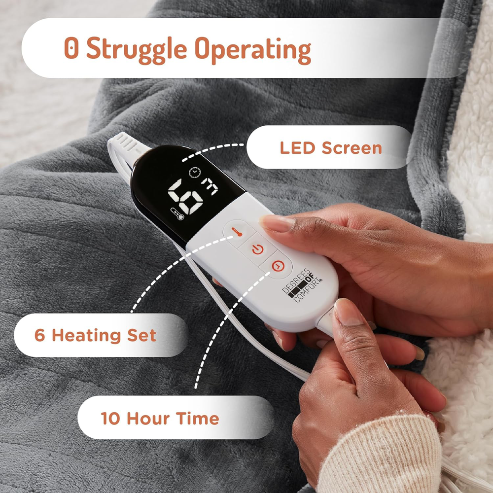 Absolutely love this king-size heated blanket! The soft Sherpa and flannel fabric feels cozy, and the six heat settings let me find the perfect warmth. Heats up fast, and the free shipping was a bonus—arrived way sooner than expected. Customer support is top-notch, and knowing there's a satisfaction guarantee makes it a stress-free purchase. Perfect for chilly nights!