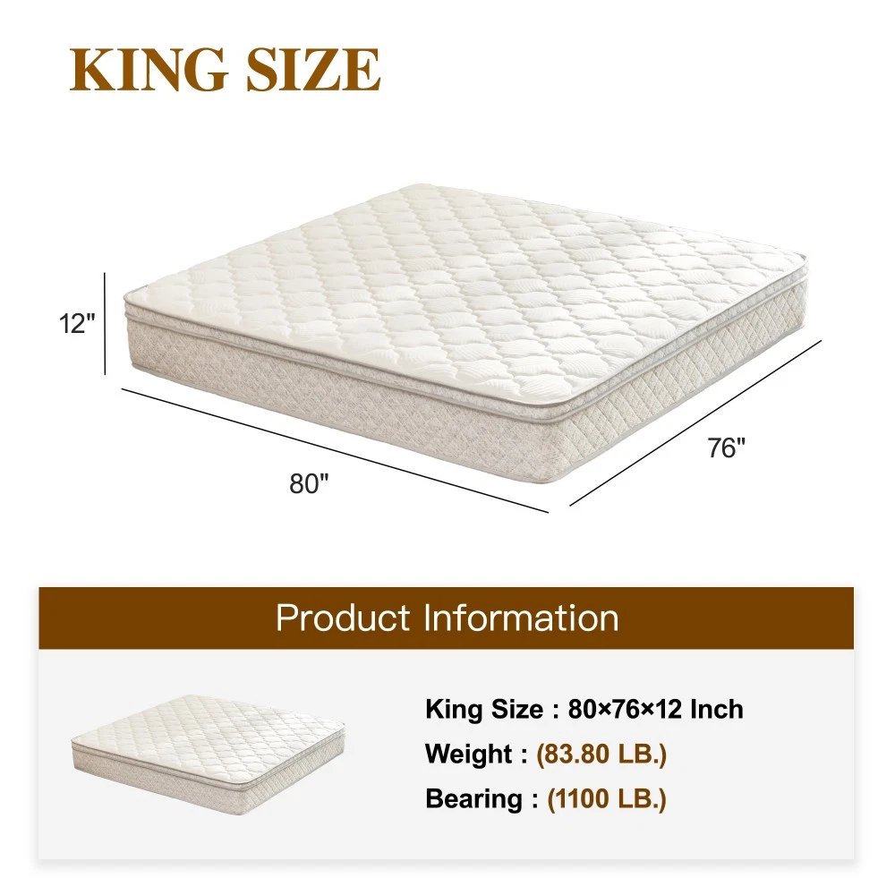 King Size Mattress 12 Inch Hybrid Mattress in a Box - Memory Foam & Pocket Spring Experience luxurious, unrestricted sleep with our 12 Inch King Size Hybrid Mattress! Crafted with premium memory foam and individually wrapped pocket springs, this medium-firm mattress delivers the perfect balance of pressure relief, zoned support, and all-night comfort—ideal for modern bedrooms and anyone seeking a restful night’s sleep. Key Specifications Mattress Dimensions (Assembled): 76" W x 80" L x 12" H | Weight: 83.77 lbs Packaging Dimensions: 78.74" L x 11.00" W x 11.00" H | Weight: 87.30 lbs Material: Foam + Spring | Filling: Memory Foam | Color: Grey + White | Style: Modern Why Choose This King Size Hybrid Mattress? Ultimate Spacious Comfort for Couples & Families: The 76" x 80" King size offers maximum sleeping space, 16" wider than a Queen mattress. Perfect for couples who want extra room to move freely, or families sharing the bed with kids and pets—no more feeling cramped during the night! Certified Safe & Healthy Sleep Environment: Features CertiPUR-US certified foam that’s free of ozone depleters, heavy metals, and harmful flame retardants. The OEKO-TEX Standard 100 certified fabric is scientifically tested for over 300 regulated substances, ensuring a safe sleep space for you and your loved ones. Advanced Temperature Regulation: Gel-infused memory foam actively draws heat away from your body, preventing overheating. Combined with an open-cell foam structure and 1000+ pocketed coils, air circulation is maximized, keeping you cool and comfortable all night long. Superior Motion Isolation & Edge Support: Individually wrapped pocket springs work independently to eliminate motion transfer—say goodbye to being disturbed by your partner’s movements! Reinforced perimeter support prevents edge sagging and evenly distributes weight up to 800 lbs, ensuring consistent support from head to toe. Hassle-Free Delivery & Setup: Ships compressed in a compact, easy-to-handle box. Simply unbox, unroll, and watch it expand to its full 76" x 80" size within hours. Fits all standard King bed frames perfectly (a sturdy foundation is recommended for optimal support). Reliable After-Sales Guarantee We stand behind the quality of our mattress with a 1-Year Warranty against manufacturing defects. Plus, enjoy a 30-Day Free Return & Exchange Policy —try it risk-free for 30 days! If you’re not completely satisfied with your sleep experience, we’ll arrange a hassle-free return or exchange.