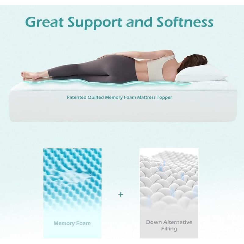 About this item SUPPORTIVE MEMORY FOAM LAYER: Hansleep memory foam mattress topper boasts a unique structure that combines a gel-infused memory foam layer and down alternative fillings. This design ensures weight distribution is even and pressure is relieved from different points of the body. It's an excellent addition for a firm mattress. PREMIUM SURFACE: This mattress topper features a 3D premium surface that wicks away night sweat. Combined with the cooling gel infused in the memory foam, it provides a breathable and comfortable sleep environment. DEEP POCKET DESIGN: The deep pocket mattress pad can stretch up to 21 inches deep, ensuring it fits snugly on any mattress and stays in place throughout the night. EASY TO INSTALL & MAINTAIN: The fitted sheet design of this mattress cover makes it incredibly easy to install on your mattress. It is also machine washable, which means it can be effortlessly cleaned and maintained, providing you with an effortless and hassle-free experience. CARE INSTRUCTIONS: Hansleep mattress topper comes vacuum-packed and may appear thinner upon unpacking. Please allow it two days to regain its shape and thickness. Spot cleaning only. Brand Hansleep Color White Size King 78" x 80" Fabric Type 80%polyester, 20%viscose Special Feature Moisture-Wicking, Breathable You may also like Cooling Pillow Shredded Memory Foam Adjustable Soft Firm Support Sleepers New 27.69 USD 32.39 USD 5.99 USD 15% off 1 Drawer Nightstand Storage Table Portable Accent Table Home Office Dorm New 38.69 USD 42.11 USD Free shipping 8% off Cocoon Foam Bed Pillow Hypoallergenic Removable Cover Shape Retaining Support US 40.76 USD 44.89 USD 5.99 USD 9% off Farmhouse Stripe Bath Towel Soft Cotton Terry Bathroom Gift Multi Color New 31.41 USD 34.71 USD 5.99 USD 10% off Compact 0.7 Cu Ft Microwave Oven W/ Touch Presets & Rotating Turntable New 78.15 USD 82.26 USD 5.99 USD 5% off Universal Car Headrest Pillow Cervical Support Breathable Easy Clean Adjustable 30.38 USD 31.98 USD Free shipping 5% off Kids Lawn Mower Toy Outdoor Pretend Play Push Toy Gardening Tool Set Fun Sounds 53.01 USD 55.8 USD Free shipping 5% off 10 Shotgun Storage Rack Folding Weather Proof Portable Organizer Holder Garage 62.49 USD 74.99 USD Free shipping 17% off All Terrain Wagon W/ Air Tires Rugged Steel Construction Safe Design Kids New 365.65 USD 384.89 USD Free shipping 5% off 10 Pcs Non Stick Cookware Set Die-Cast Aluminum Kitchen Pots Pans Induction Use 94.99 USD 99.99 USD Free shipping 5% off 7PC Ratcheting Wrench Set Chrome Vanadium 72 Tooth Swing Arc Mechanics Tool New 42.43 USD 46.7 USD 5.99 USD 9% off Air Conditioner Cover Weather Protection Dustproof Reusable A/C Unit Guard Strap 33.95 USD Free shipping