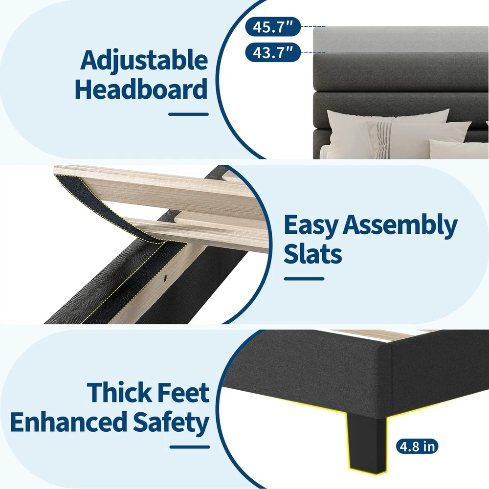 About this item Stylish & Comfortable: King size bed frame features linen upholstered headboard adds elegance and sophistication to your bedroom. High-quality and affordable headboard that looks great and provides excellent support and providing a comfortable backrest for reading or watching TV. Adjustable Headboard: The king bed frame with headboard can be adjusted from 43.7'' to 45.7'' giving you the flexibility to create the perfect sleeping environment for your need. The linen fabric upholstery is designed to be both stain-resistant and wear-resistant. Sturdiness & Noise-Free: Extra-thick heavy-duty feet that provide a stable base and superior stability and support without any wobbling or shaking. Can support up to 1000 pounds of weight. The Eva mute bar prevents noise from friction,ensuring a quiet, shake-free sleep without squeaks or creaks. Wooden Slats & No Box Spring Needed: Design with Veclro wooden slats for fast assembly also the mattress doesn’t slide around on it. Provide the excellent support for your mattress and durability. Memory foam or spring mattress without the need for a box spring. Most important thing to note is support your mattress and prevent it from sagging or shifting. Quick Assembly: The king bed frame with headboard with headboard ships in one box and is easy to follow the simple assembly instruction with no special tools required. The process is straightforward and hassle-free, you can set it up in no time. Product Description Previous page Next page Adjustable Headboard 4.8'' Under Bed Space 4.8'' for Storage Space Previous page Next page Soft Touch Headboard Headboard & Feet Veclo & EVA Bar Special Feature Adjustable Headboard Adjusted From 43.7'' to 45.7'' Veclo Design for Quicken Install Wood Slats The Mattress Doesn’t Slide Around on It Heavy Duty Feet Max. Capacity 1000 Lbs Payment Delivery details Terms of sales About us Contact us Payment We accept payment either via PayPal or any of the following credit cards; Visa, MasterCard, Discover, and American Express. Delivery details 1. We will delivery out at the handing time when we receive the payment. 2. The delivery time is 3-5 business days to US by usually time.The parcel maybe delay 1-2day of the weekend.Due to the bad weather,Holidays,Hot Season ect.the parcel maybe delay,If you have any problems,mssage us,we will try our best to solve it. 3. We ship to your eBay address. Please make sure your eBay address is correct before you pay. 4. If you want to change the shipping address,message us before our send out. Terms of sales If you are not satisfied with the item for any reason, please do not quick to leave negative/neutral feedback even open request and case without any communication with us. We devote ourselves making EVERY CUSTOMER in 100% Satisfactory and resolve any problem. Thank you for your understanding and recognition,we are always leave positive feedback to all our customers. About Reply: All replies will be sent to your email box, if you do not get response within 24 hours (Sat. & Sun. excluded) please check your eBay My Messages in case that our emails will be filtered automatically by your settings. About us automobilee-01 is a brand new store but we are one of North America’s top online suppliers of specialized, high-quality aftermarket online retailers and suppliers, committed to developing new markets. We primarily offers tool sets, auto parts, home goods, etc..With over 20 years of product selection and manufacturing experience, we delivers unparalleled quality, value, service and satisfaction. Our highly-trained, professional staff offer in-depth knowledge and personalized assistance for customers worldwide. Providing our customers with a simple, hassle-free experience with best-in-class customer service is more than a goal. Contact us Any problem please rest assure to contact us by eBay message first. We will reply you as soon as we can. We will deal with it within 24hs on working days. Brand Unbranded Compatible Mattress Size King Frame Material Wood, Metal, Fabric Type Bed Frame Features Adjustable Headboard, Durable Color Gray Mattress Included No Assembly Required Yes Style Contemporary/Modern Shape Rectangular MPN Does not apply Care Instructions Easy Care Room Bedroom Country/Region of Manufacture China Item Length 82.7'' Item Width 80'' Item Height 45.7'' Department Adults Footboard Height 8.6'' Product Dimensions 82.7"L x 80"W x 45.7"H Upholstery Fabric Fabric Manufacturer Warranty 5 Years