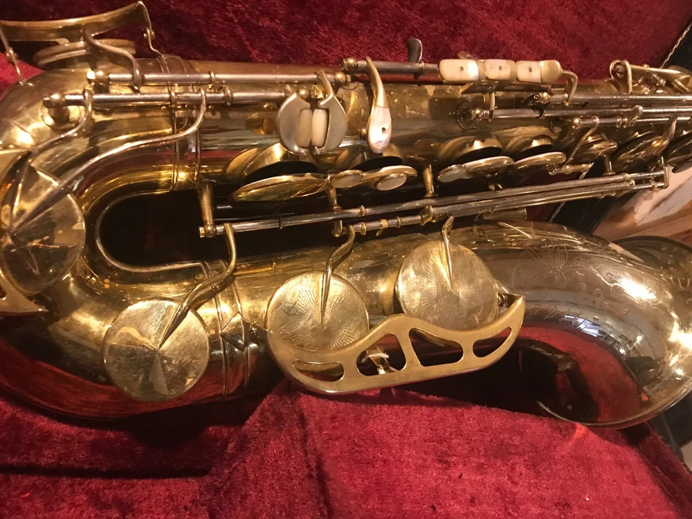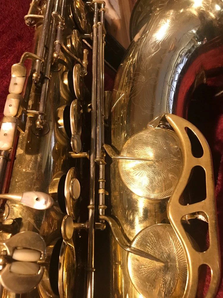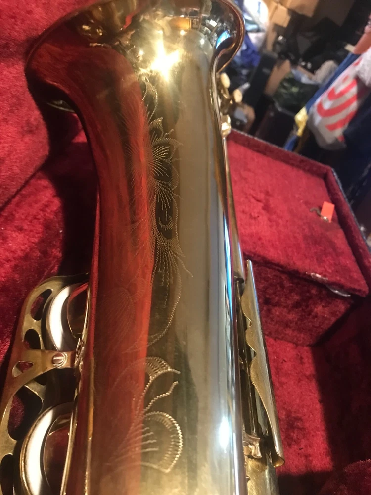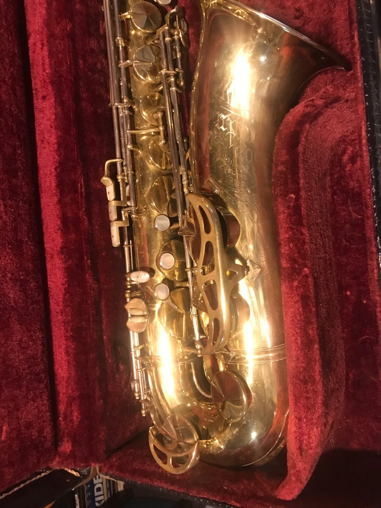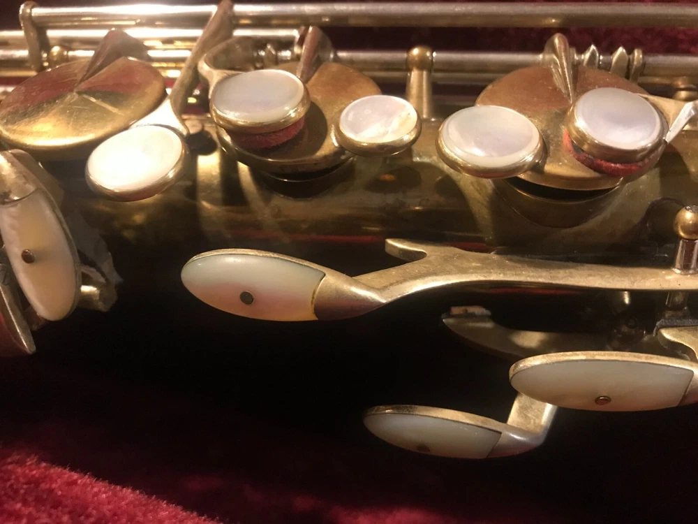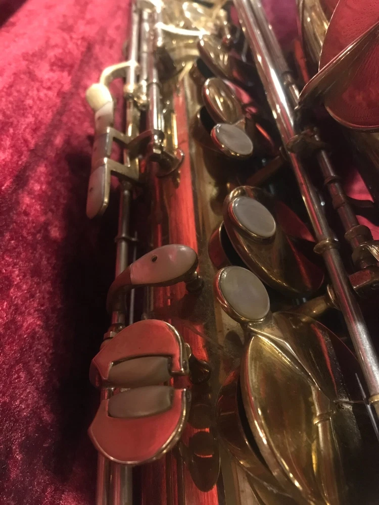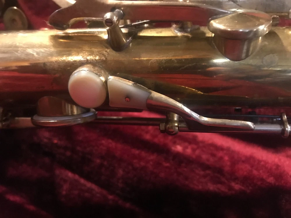 Great horn in very good condition with very light signs of wear. Hard to see but maybe a tiny ding here and there not substantial enough to plainly see in pix. Has no lacquer shine just the quality brass metal of the body. All the keys and pearls are in tacked and the horn looks great. If you need more info feel free to contact me and I will do my best to provide it. This sax is modestly priced and all reasonable serious offers will be considered. Thank you.