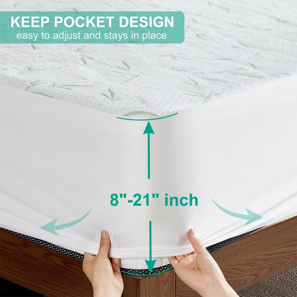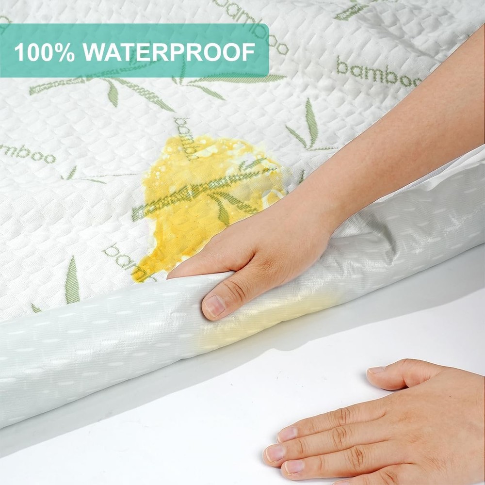 The top TPU on the back of our king size mattress protector is 100% waterproof. It keeps your mattress free from stains and protects it. The waterproof king mattress protector is made of natural bamboo fabric with no chemical additives, allowing you to sleep healthier. The filling of our waterproof mattress cover surface is 3D air fabric, which improves the mattress's breathability. The waterproof mattress cover for king size bed is a 360° shield with elastic bands all around, preventing the mattress from moving. 100% Waterproof – Our king mattress protector is designed to shield your bed from spills, sweat, and stains with an advanced TPU layer, ensuring a clean and fresh bed every night. This waterproof mattress protector fits perfectly, offering unbeatable comfort and durability. Whether it's for kids, pets, or daily use, the king size mattress protector keeps your bed pristine. Upgrade to our king mattress pad today and enjoy worry-free sleep every night! Soft Bamboo Cooling Fabric – Experience ultimate comfort with our mattress protector king, crafted from ultra-soft bamboo viscose that wicks moisture and keeps you cool. This mattress cover king size bed offers breathable protection, while the king size mattress protector waterproof ensures your bed stays fresh and dry. Upgrade to our mattress pad king for a luxurious, worry-free sleep every night! Noiseless & Durable Design – Rest easy with our waterproof mattress protector king, designed for silent, uninterrupted sleep. The king waterproof mattress cover offers reliable protection, while the king mattress cover protector ensures your bed stays fresh and dry. Crafted for durability, the king size mattress pad maintains its shape and quality even after 100+ washes, providing long-lasting comfort and peace of mind. Deep Pocket Fit – Our king mattress protector waterproof is designed to fit mattresses up to 21" deep with an elastic skirt for a snug, secure fit. This king mattress cover stays in place all night and works perfectly with memory foam, latex, or spring beds. Protect your investment with the king size waterproof mattress protector and enjoy the ultimate convenience and comfort of our premium mattress cover! Easy Care & Maintenance – Keep your bed king size fresh with our bed pads washable waterproof, perfect for families with kids, pets, or elderly members. The waterproof king mattress protector is machine washable and dryer safe for effortless cleaning, while the durable king size mattress cover ensures long-lasting comfort and protection for your bed.