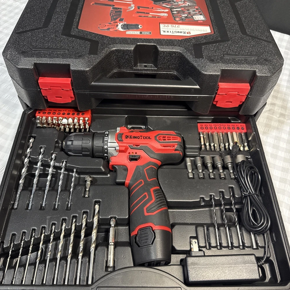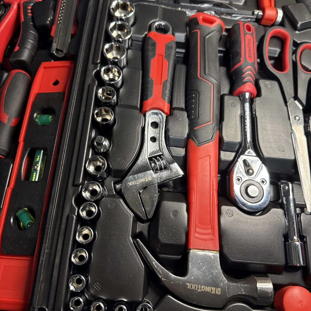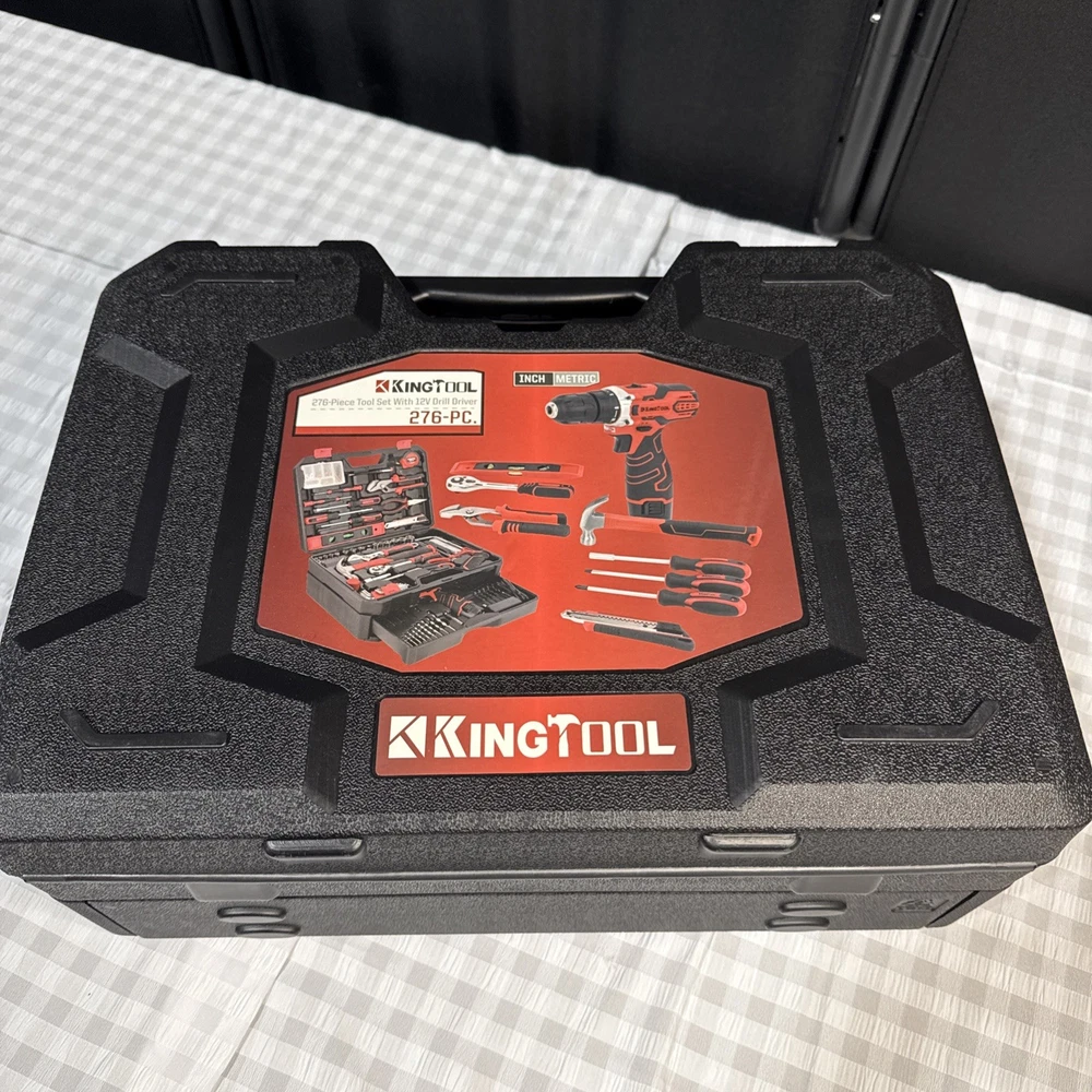 The KingTool 265 Piece Tool Set includes a wide variety of household and DIY tools, such as hammers, screwdrivers, wrenches, power drills, and pliers. The tools are organized in a hard case for easy storage and transport, and all pieces are included in the set. With a metric system of measurement and a mix of both metric and imperial units, this set is suitable for a range of projects around the home or in the workshop. The black and red case adds a stylish touch to this comprehensive tool collection.