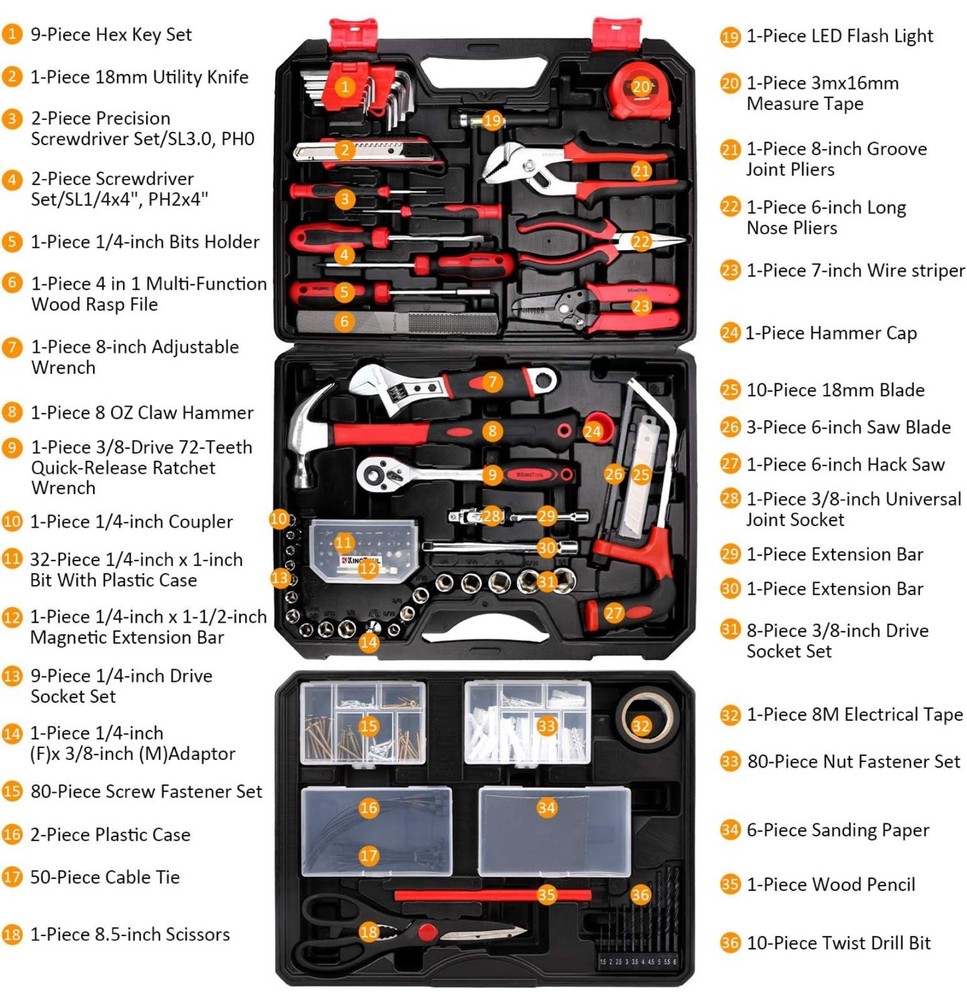 [Toolbox Included] - Includes 1-Drawer storage box with independent sliding drawer to enlarge the capacity more than common toolbox. Assortment of necessary tools are in one tool chest, durable plastic case with internal molded compartments to keep each component protected and easily accessible. All tools meet or exceed ANSI standard. [High Quality Material] - Made of high-quality steel and finished in heat treated chrome, durable and corrosion resistance. Handles made of TPR material, comfortable for grip. [Muti-purpose Tools Kit] - 325Pcs tools set for most small repairs and DIY projects around the house. It is perfect for handyman, construction workers, mechanics, work shops etc. This tool set is also a good gift choice for family member, friends, partners, etc. [Complete Varieties] - Comprehensive assortment of professional-grade wrenches, a complete range of 1/4 inch and 3/8 inch metric-sized sockets and precision screwdrivers, hammer, tape measure, pliers etc. The 72-tooth ratchet. Variety of 1/4-inch screwdriver bits: Phillips, slotted, square, star and pozi. Soft-grip handle on screwdrivers, pliers, srtipper and hammer provides excellent comfort and control. [Great Gift Choice] -This tool kit is easy to carry and stock. It is a good gift choice for men and women. Also this tool set is perfect for Father's Day, and is a great option as gift for Dad, Boyfriend & Brothers when chrismas.