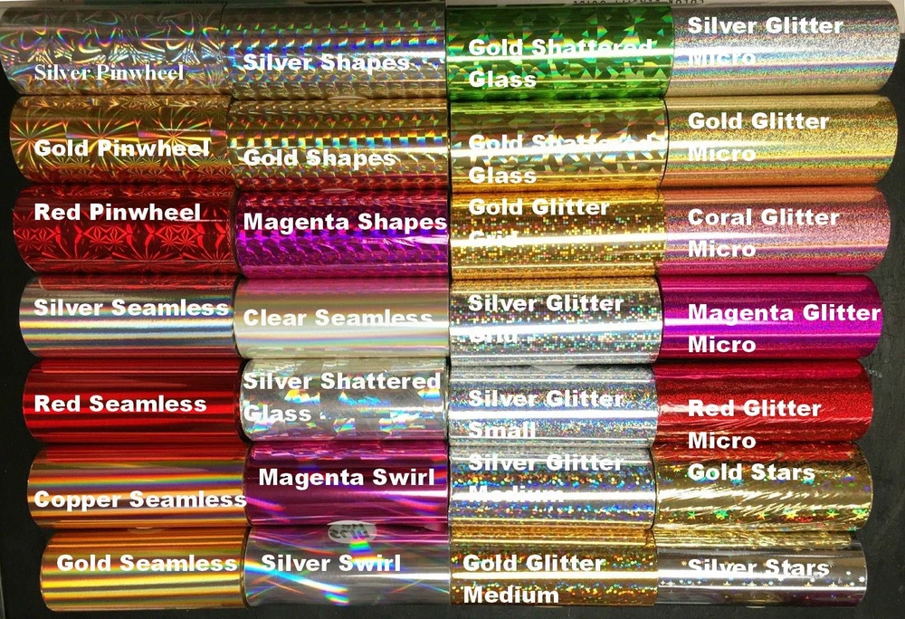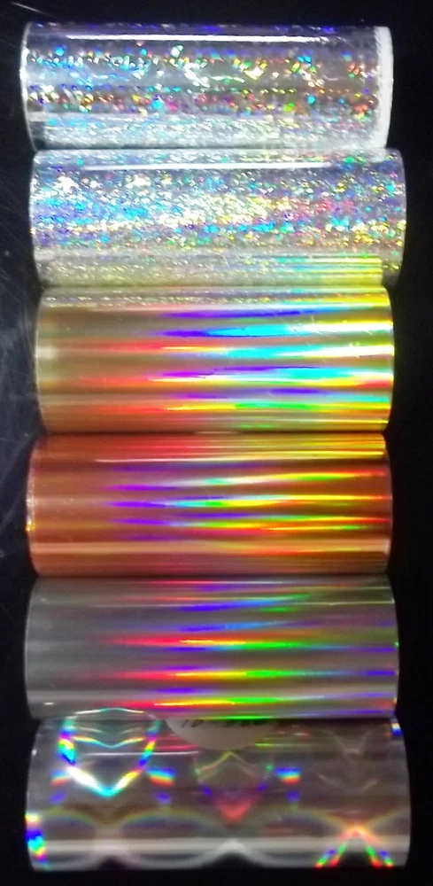 NOTICE: If you need a canister replacement tube for use on a Kingsley Hot Stamping Machine you may order this package with one for only $6.00 additional. The canister alone sells for $10.99, so you would save $4.99 with the combination package (order it at eBay item number 295504448447). OR, if you need just a canister, order it at eBay item number 251440623971. For more information about the canister, see "Canister Replacement Tube" below.* Be sure to give me a list of your choices for color and style (see list below*) Price Reduced! Holographic Foil is normally about 3 times pricier than regular brilliant foil, but because I can buy large remnant master rolls, I have lowered the price considerably. T his 3-pack is now priced at less than half of the former price. This foil is hand-rolled down, from large master rolls, to 100 feet in length, three inches wide, on 1/2 inch cores, so they will work in a canister with the Kingsley auto foil feeder. Remember that most rolls from Kingsley, Howard, Jason, etc. are less than half as long at 40 feet; ours are 100 feet long. Also, foil rolls that are 200 feet long, or longer, will not fit the canisters with the auto feeder. If you already have a canister replacement tube, order this foil without one. See CANISTER REPLACEMENT TUBE below* And if you need just a canister, see eBay item number 251440623971. This offer is for your choice of 3 rolls of holographic foil from a current list of 32 selections, listed below (see 2nd picture for style identification). Use the "Note to seller" box at checkout to let me know your 3 selections and/or if you need this foil on 5/8" or 1" cores. If you miss this box, use eBay messaging to send me your list of preferences. I f I don't hear from you the same day, I will ship popular patterned colors and styles, since the production of fishing lures has made these the most popular, by far. ABOUT HOLOGRAPHIC FOIL • Holographic foil, at15 microns, is usually thicker than brilliant foil (12 microns) so a 100" roll is greater in diameter, but still fits in the canister. • Photography exaggerates the effect of the hologram; the actual colors are not quite so bright. • These rolls are 95 feet long, more than twice as long as standard Kingsley rolls. • "Seamless" means there is no pattern or shapes in the hologram - the colors simply blend into each other. • "Patterned" indicates a variety of shapes in the hologram. • Terms: "Glitter" is used to describe several types of patterned holographic foil. The size of the glitter is usually further identified with words like "micro," "mini," "small," "medium,” “large.” Still larger random patterns might be called "shattered glass" and "shapes." *Choose any 3 rolls from the following list of 32 styles SEAMLESS Y203-2 - Gold HX5065 - Copper S2-2 - Silver HX-5075 - Red R210-1 - Magenta SL-T01 - Clear Transparent HX4175 - Magenta Swirl Y204-3 - Gold Swirl HX4110 - Silver Swirl PATTERNED S2-7 - Silver Micro Glitter Y208-7 - Gold Micro Glitter R213-7 - Red Micro Glitter R212-7 - Magenta Micro Glitter S2-8 - Silver Small Glitter Y217-8 - Gold Small Glitter (Grid) S2-9 - Silver Medium Glitter (Grid) Y207-6 - Gold Medium Glitter S2-10 - Silver Medium Glitter S2-11 - Silver Large Glitter (squares) G201-13 - Green Shattered Glass Y214-13 - Gold Shattered Glass S2-13 - Silver Shattered Glass SL-S28 - Silver Shapes SL-G22 - Gold Shapes R215-14 - Magenta Shapes SL-S21 - Silver Bubbles Y205-4 - Gold Stars S2- 4 - Silver Stars SL-G53 - Gold Splotches SL-G46 - Gold Pinwheel SL-R46 - Red Pinwheel SL-S46 - Silver Pinwheel SPECS • Three rolls of holographic foil, for hot stamping on most surfaces • All rolls fit our canister replacement tube, not included • Choose any 3 from 32 rolls • 3 inch wide foil on 1/2" core • 95 foot long rolls • Now just $6.66 per roll • Compare at $45 for 3 rolls ABOUT CANISTER REPLACEMENT These rolls of assorted color foil, ideal for hot stamping virtually any surface. They are approximately 100 feet long on 1/2 inch cores and will fit our canister replacement tube (included). Kingsley produced 40 foot foil rolls in canisters to function with the automatic foil feeding system included in virtually every Kingsley machine. Since these canisters are no longer in production, several specially designed tubes have been produced to allow the automatic foil feeder to work with any foil rolls; ours is one of them. These rolls of foil are on a 1/2" core, and the maximum inside diameter of most new tubes is 1 3/8," so these rolls will fit inside the tubes and work with the auto foil feed system. If you need.a canister replacement, order this foil package with one at eBay item number 295504481447 . ORDERING THE RIGHT FOIL This foil will work on virtually any hot stamping machine at about 250°, but if you want to use it in an auto feed foil system, you will need to do a little research into your machine and order foil accordingly. If you have a Kingsley machine, you can take advantage of my research, explained here. Kingsley developed 3 distinct foil feeding systems through its production history, detailed below. 1. IF you have a Kingsley M-50 you are likely using the canister system. For many years Kingsley rolled its foil on a 1/2" core and enclosed it in a cardboard canister. The canister was highly protective and most of it is still good even though it may be 50 years old. This listing is for NEW foil for this canister system, but foil in canisters is becoming a thing of the past. So there must be another way to hold the foil; hence the canister replacement tube. If you don't have one and you want to use Kingsley's auto foil feeder, you should order this foil package with a canister tube (item number MG3C-3). The canister system is explained more fully above. 2. IF you have a Kingsley M-60 or M-75 with the EZ FOIL ADAPTER, using the white "dog ears" (that's what Kingsley called them) to hold the foil. Just send us an email request for this foil to b