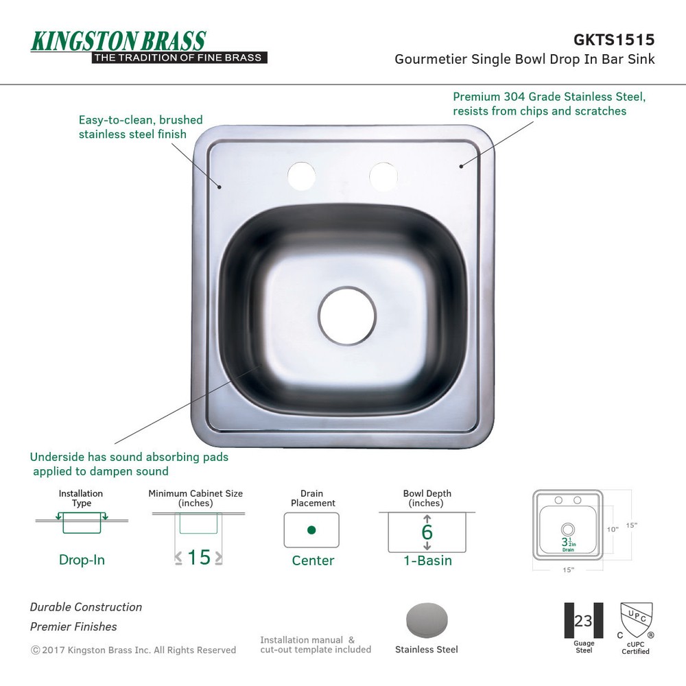 Powered by Frooition All Categories Kingston Brass GKTS1515 22 Gauge Drop In Single Basin Stainless Steel Bar Sink Overview Item Description Kingston Brass GKTS1515 Features: Faucet holes: 2 Faucet hole size: 1-1/2" Installation type: Drop In Number of basins: 1 Includes soap dispenser: No Drain connection: 2" Gauge: 22 Kingston Brass GKTS1515 Specifications: Length: 15" Width: 15" Height: 5-11/16" Basin Length: 12" Basin Width: 10-1/16" Why Choose BuildInc? OUR PROMISE TO YOU About Us At Build, we promise to provide the best selection we can, most competitive pricing, and unmatched customer service. Our store has quality home improvement products from trusted manufacturers like Moen, American Standard, Delta, Kraus, Kichler, Progress Lighting, Schlage, Kwikset, Baldwin, Broan, NuTone, Air King, and Rev-A-Shelf. With over 200,000 home improvement products for you to choose from, we have just what you need to get your project done. Fast & Free Shipping We promise to make it our priority to get you your items as fast as we can. We ship from 440 warehouses around the country, ensuring that your product will get to you as soon as possible. We know you're eager to get your hands on your new purchase, we would be too. As a bonus, most items ship for free. Returns We are happy to accept returns of unused or defective items for a refund within 30 days from the date of delivery. For returns outside 30 days, please contact our Customer Service team to go over our options. For full details, please view the Shipping and Payments tab above. To initiate a return simply go to the eBay Returns Portal and submit a return request. We ask that all items be returned with all original components via a traceable method. Once your return is received and processed, we will quickly get your refund or replacement issued. If for any reason you are unsatisfied with your purchase or for product or warranty questions, please contact Customer Service team for assistance. More Items! View more great items! About Us | Shipping | Returns | Contact Us | FAQ | Collections | Special Offers! Powered by Frooition Frooition Frooition | No-js Template | eBay design, eBay store design, eBay shop design, eBay template design, eBay listing design (ver:froo_no_js) This listing is currently undergoing maintenance, we apologize for any inconvenience caused.