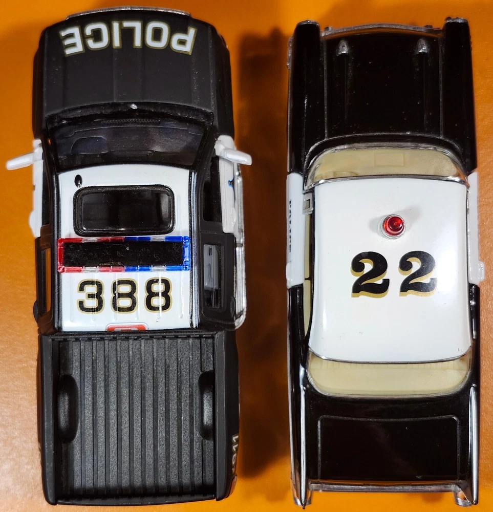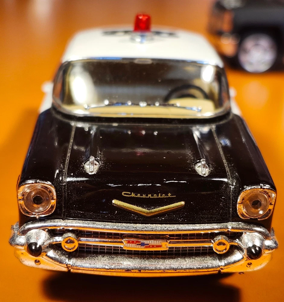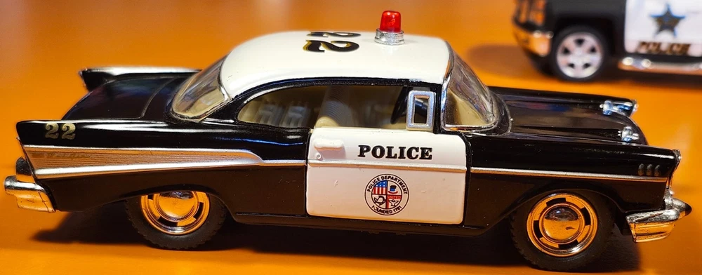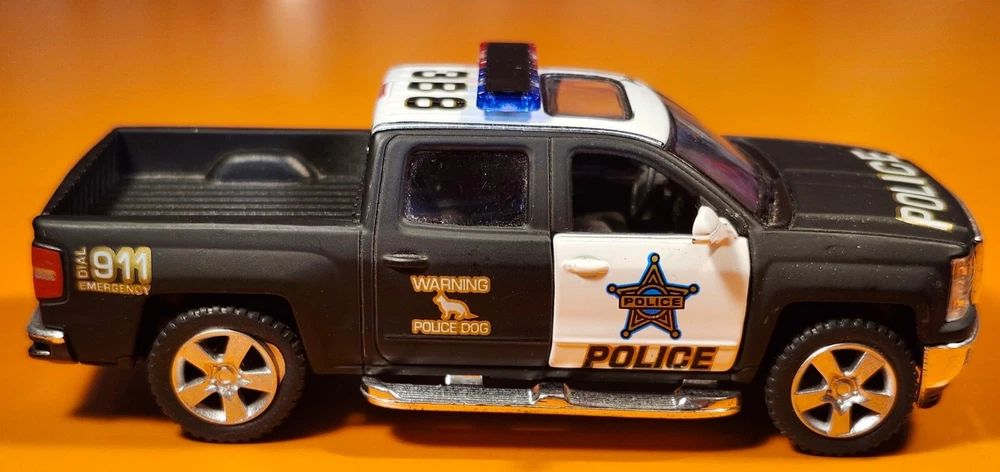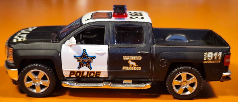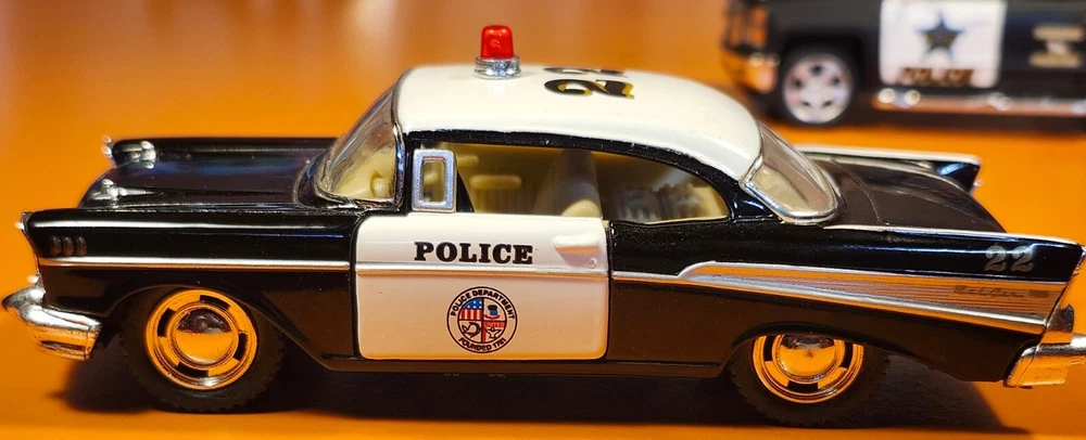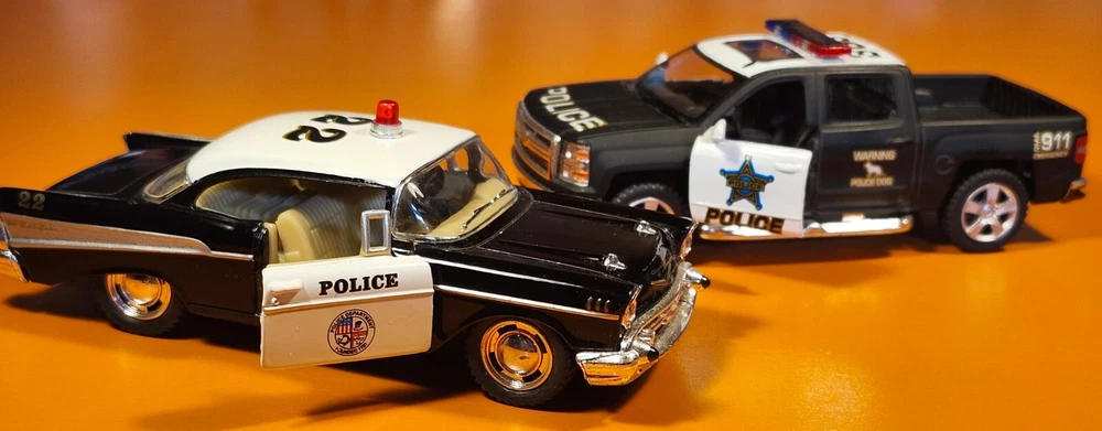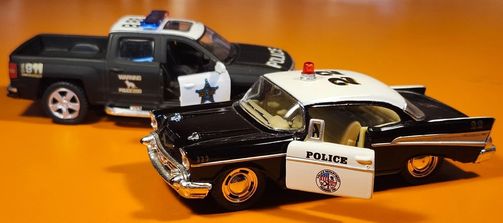 The Kinsmart Diecast Chevrolet Police Bundle features a Chevy Bel Air and a Chevy Silverado Police Pull-back vehicle in Black and White colors with opening doors. Incredible detail and Real Rubber tires on both these models! These diecast models are part of a collection of contemporary manufacture toy vehicles. Bad Boys Bad Boys! Fast shipping!