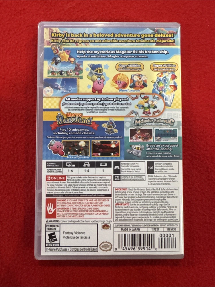 Country/Region of Manufacture: United States Game Name: Kirby's Return to Dream Land Deluxe UPC: 0045496599140 Publisher: Nintendo Games Release Year: 2021 gtin13: 0045496599140 Rating: E10+ (Everyone 10+) Region Code: NTSC-U/C (US/Canada) Platform: Nintendo Switch Genre: Action & Adventure