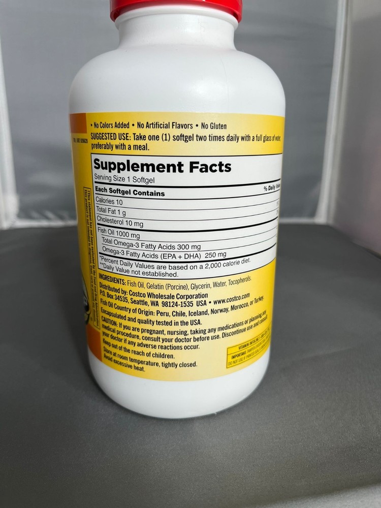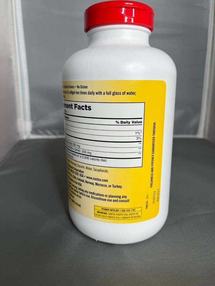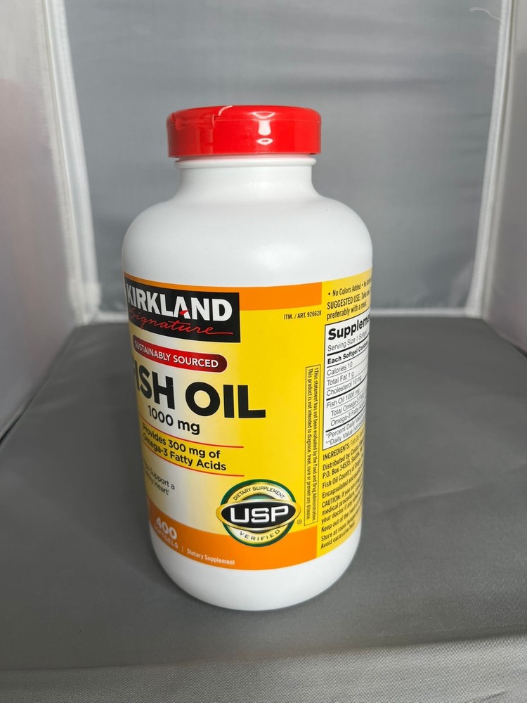 gtin13:096619926626Type:VitaminWhen to Take:Before MealIngredients:Omega-3, Fish OilCountry/Region of Manufacture:United StatesUPC:096619926626Manufacturer:Kirkland SignatureNumber of Pills:400Flavor:No Artificial FlavorsDosage:1000 mgFeatures:USP Verified, Alcohol Free, Gluten-FreeFormulation:SoftgelBrand:Kirkland SignatureMPN:926626Department:AdultExpiration Date:04/2027 or LaterModel:Does not applyMain Purpose:Vascular HealthActive Ingredients:Omega-3, Fish OilDietary Features:Gluten Free