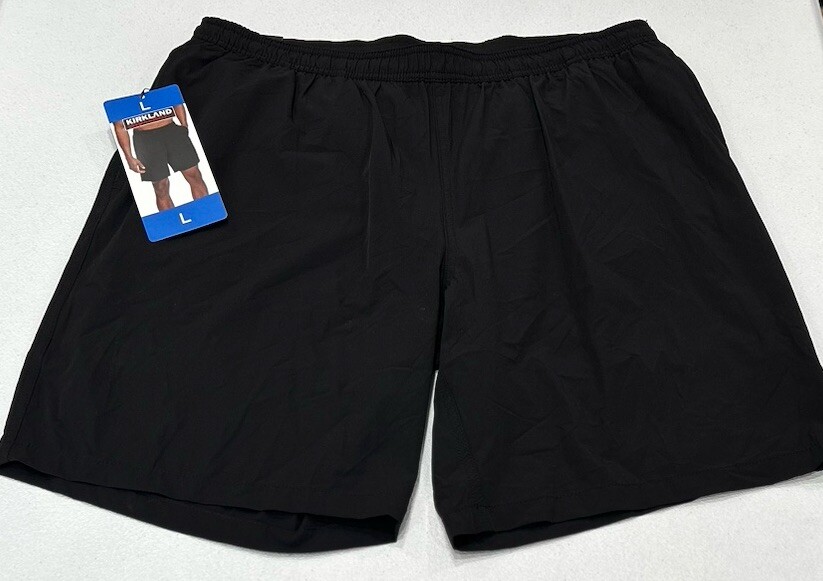 Kirkland Signature Men's Stretch Swim Shorts Size: Large Color: Black Content: Shell: 89% Nylon / 11% Elastane Liner: 90% Polyester / 10% Elastane Pocket Liner: 100% Polyester