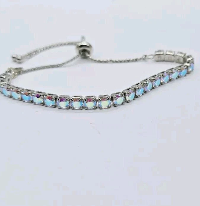 Made up of faceted aurora borealis stones that reflect flashes of rainbow colors, this bold and beautiful Bracelet can be worn casually by day or in a formal setting at night. From Kirks Folly. Plated Silver tone Aurora borealis faceted, polished finish Pull Closure or Expansion Measures approximately - One size should fit most Imported