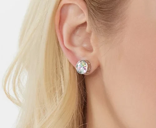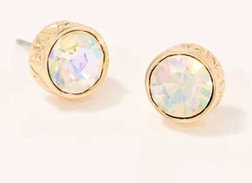 Let shimmering shine emanate from your ears when you wear these star-stamped stud earrings. From Kirks Folly. Round, aurora borealis crystals; bezel with star stamp design Posts and clutches, for pierced ears only Measures approximately 10mm