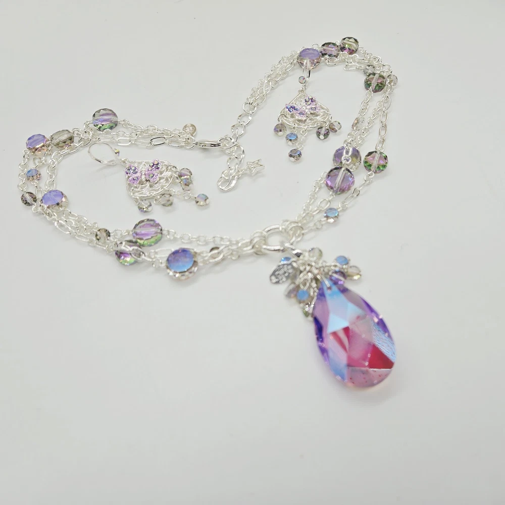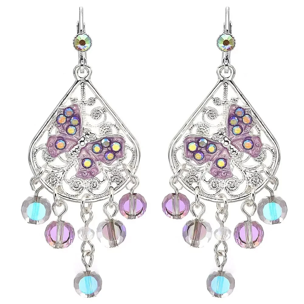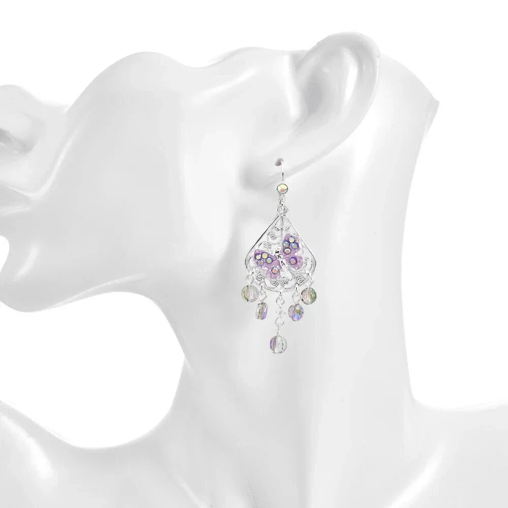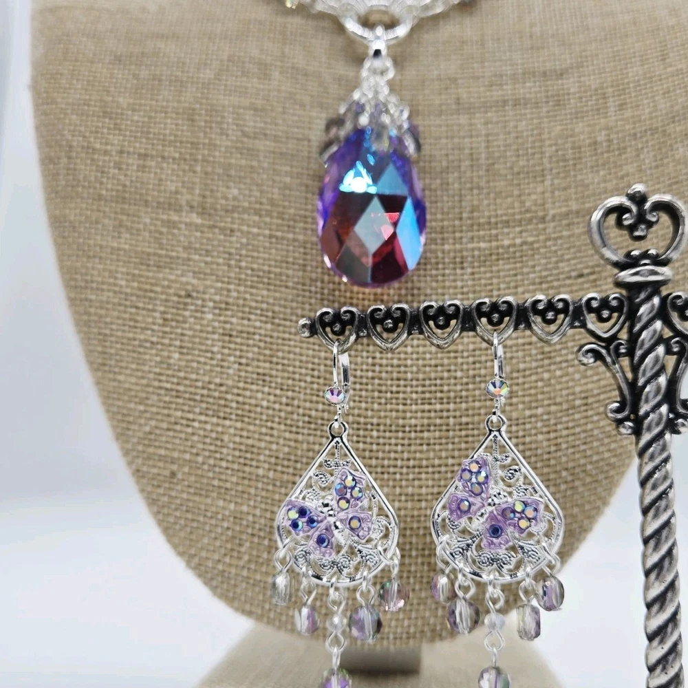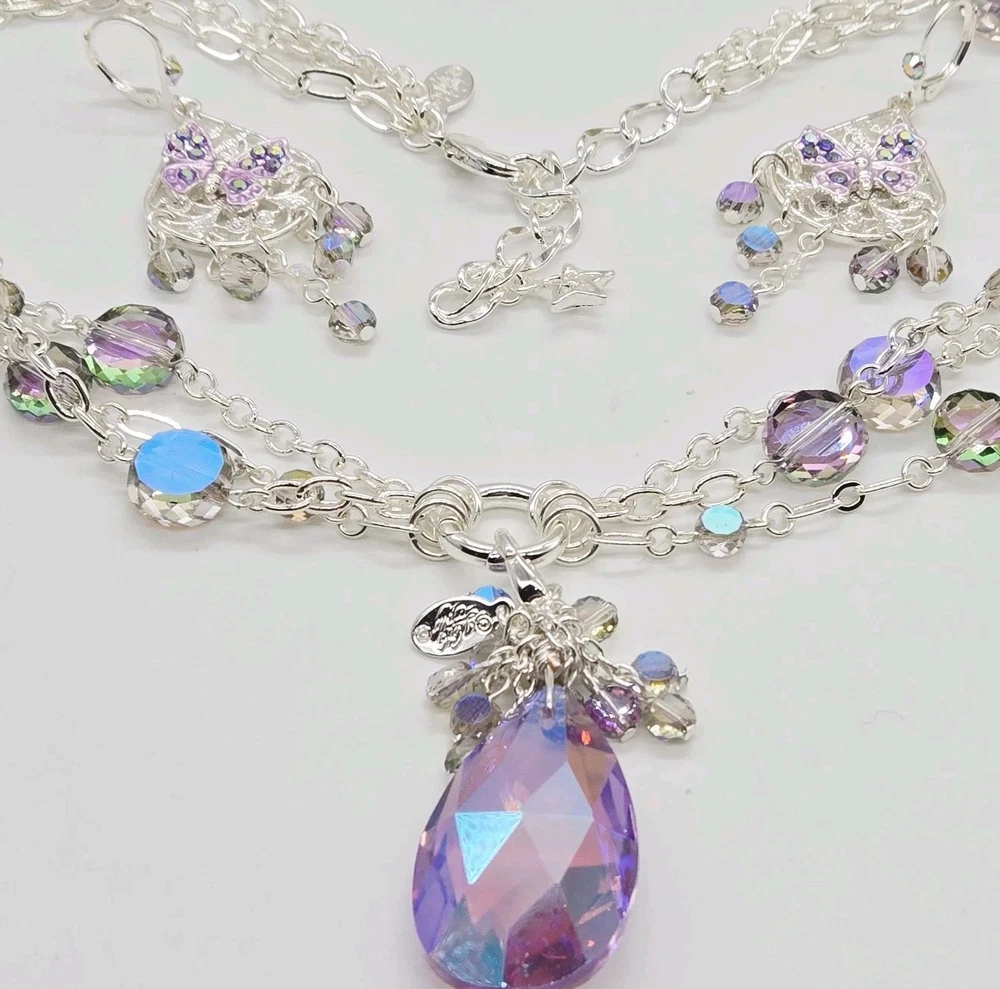 Fantasia Triple Chain Add A Charm Necklace Silvertone A cascade of shimmering chains dance like starlight, adorned with stations of glistening beads that twinkle with enchantment. At its heart rests a large round open ring, a portal of possibilities, awaiting you to add your favorite charms to weave their own tales of magic and wonder. Plated Silvertone. Measures approximately 18" long with a 3" extender chain. Crystal Lavender Dream Teardrop Open Ring Charm ( Silvertone /Lavender) The open ring charm features a crystal suspended in timeless elegance, its depths alive with prismatic light. A cascade of sparkling beads spills over the top of the crystal like enchanted twinkling dewdrops. Plated Silvertone/Lavender. Measures approximately 7/8" wide x 2 1/4" long. Fantasia Butterfly Chandelier Leverback Earrings Silvertone Graceful filigree teardrop discs dangle like whispers of moonlight, their intricate designs cradling sparkling butterflies that seem to flutter with an air of enchantment. Cascading below, faceted beads twinkle like dewdrops weaving a spell of ethereal elegance. Plated Silvertone. Measures approximately 1" wide x 2 1/4" long.