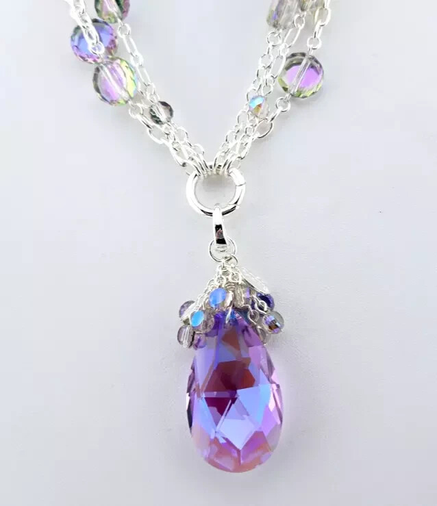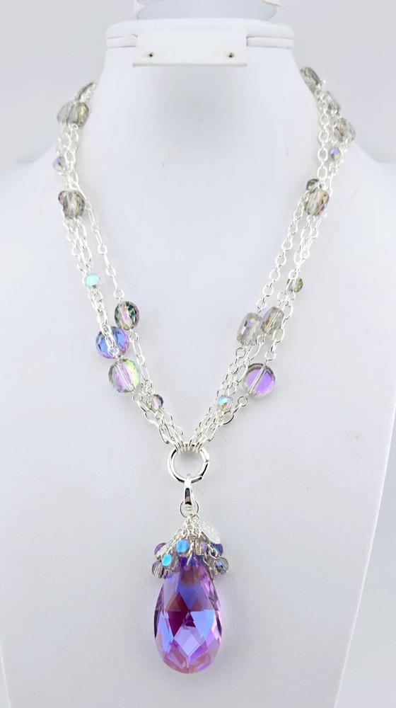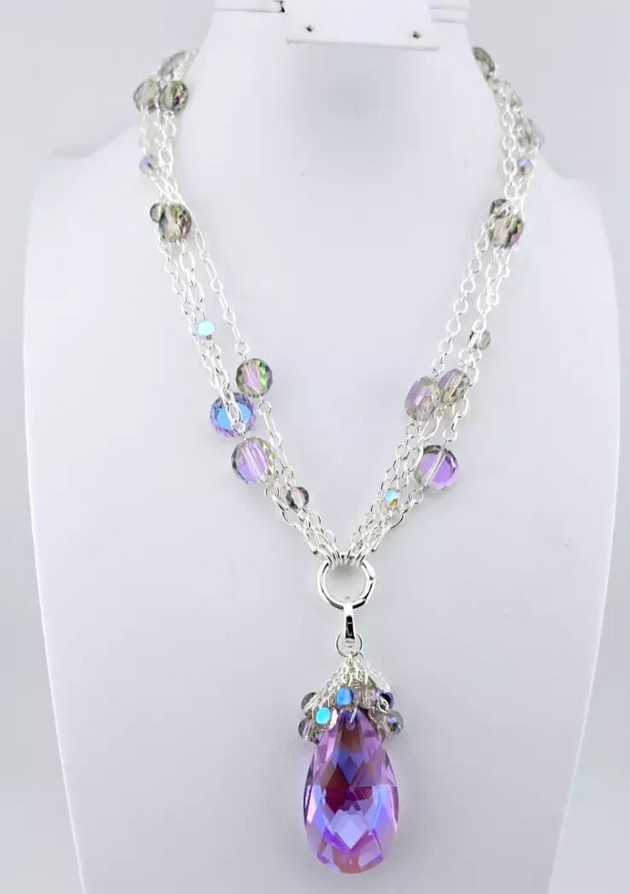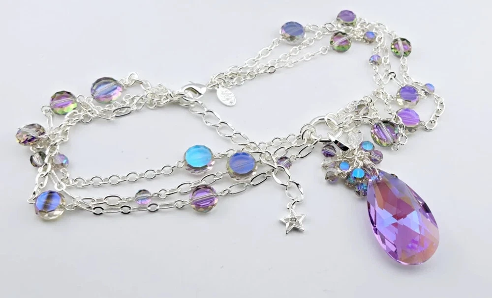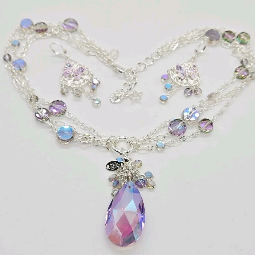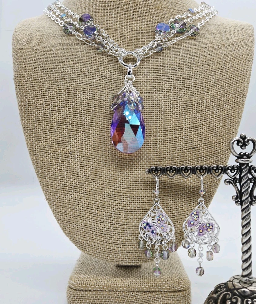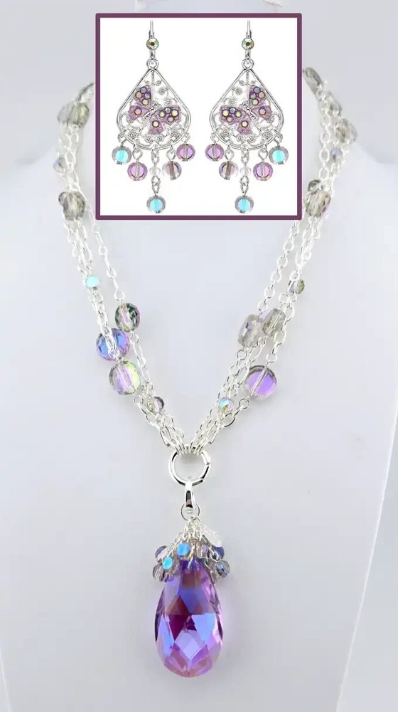 Fantasia Triple Chain Add A Charm Necklace Silvertone A cascade of shimmering chains dance like starlight, adorned with stations of glistening beads that twinkle with enchantment. At its heart rests a large round open ring, a portal of possibilities, awaiting you to add your favorite charms to weave their own tales of magic and wonder. Plated Silvertone. Measures approximately 18" long with a 3" extender chain. Crystal Lavender Dream Teardrop Open Ring Charm ( Silvertone /Lavender) The open ring charm features a crystal suspended in timeless elegance, its depths alive with prismatic light. A cascade of sparkling beads spills over the top of the crystal like enchanted twinkling dewdrops. Plated Silvertone/Lavender. Measures approximately 7/8" wide x 2 1/4" long. Fantasia Butterfly Chandelier Leverback Earrings Silvertone Graceful filigree teardrop discs dangle like whispers of moonlight, their intricate designs cradling sparkling butterflies that seem to flutter with an air of enchantment. Cascading below, faceted beads twinkle like dewdrops weaving a spell of ethereal elegance. Plated Silvertone. Measures approximately 1" wide x 2 1/4" long.