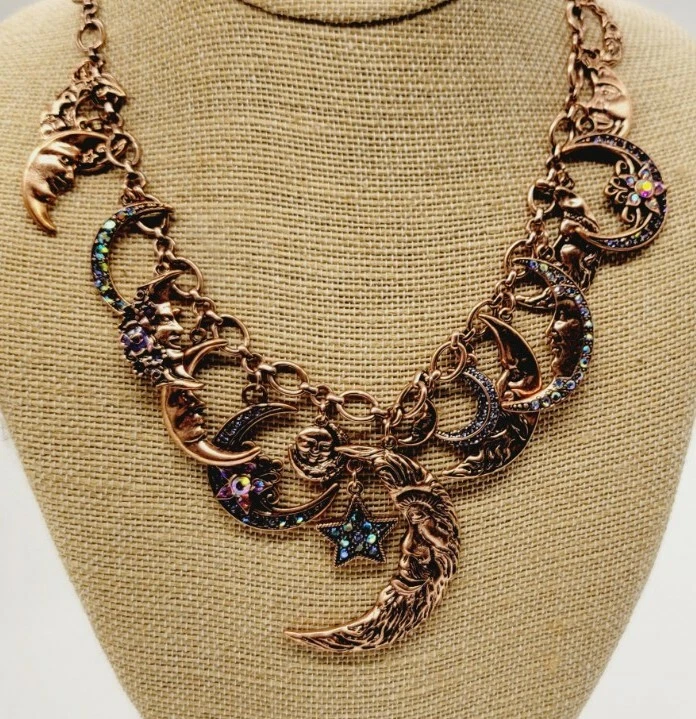 You don't have to move heaven and earth to enchant with this sparkling, conversation-starting charm necklace. Part of the Kirks Folly Moon Shadow Collection depicting our unity under the sky, each finely detailed moon face displays a look worthy of a time-treasured story. From Kirks Folly. Oval link chain; various sizes of moon charms with aurora borealis crystals, including black, clear, pink, and blue; purple epoxy enamel accents; oxidized finish Multi: Copper Lobster claw clasp Approximate measurements: Necklace 18"L x 1/4"W plus a 3"L extender; Largest charm 2-1/4"L x 1-3/8"W Pre Loved Rating B+ A- Charm was Re-Attached