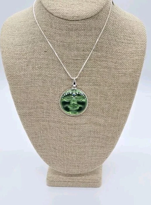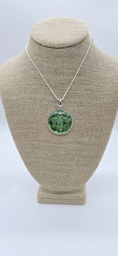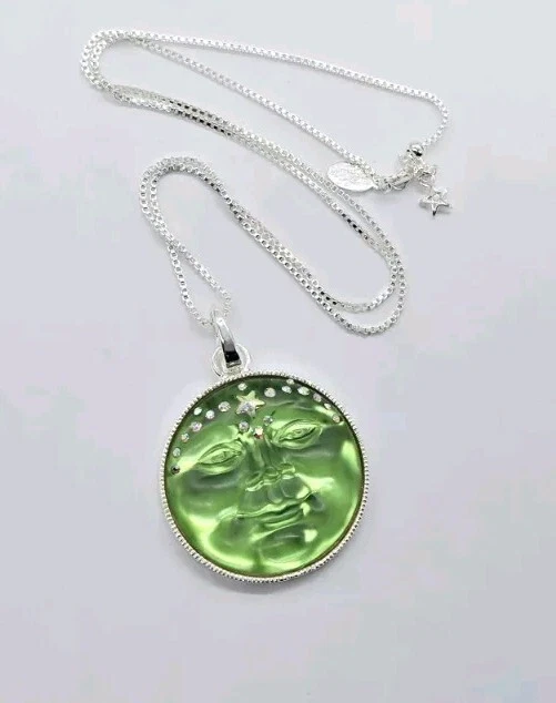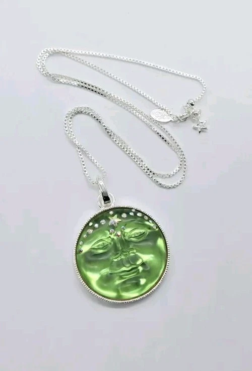 NECKLACE A remarkably versatile and slinky box chain necklace magically adjusts from 20" to as short as you need it by sliding the small bead up and down on the chain. The necklace opens with a lobster claw so you can slide on your favorite pendant or collection of treasured charms. Design a new necklace whenever you feel creative! Plated Silver tone Adjustable to 20" long. OPEN RING CHARM Both the crystal and glowing full moon on the newest and most magical Venus Moon Open Ring Charm sparkle with a brilliant aurora borealis faceted star stone. The star that graces the face of the moon is dreamy and the halo of stars around the moon, heavenly. The charm is a mystical treasure, effortlessly removable with a highly polished hinged link. Plated Sterling Silver tone - Green. Measures approximately 1 1/2" round.
