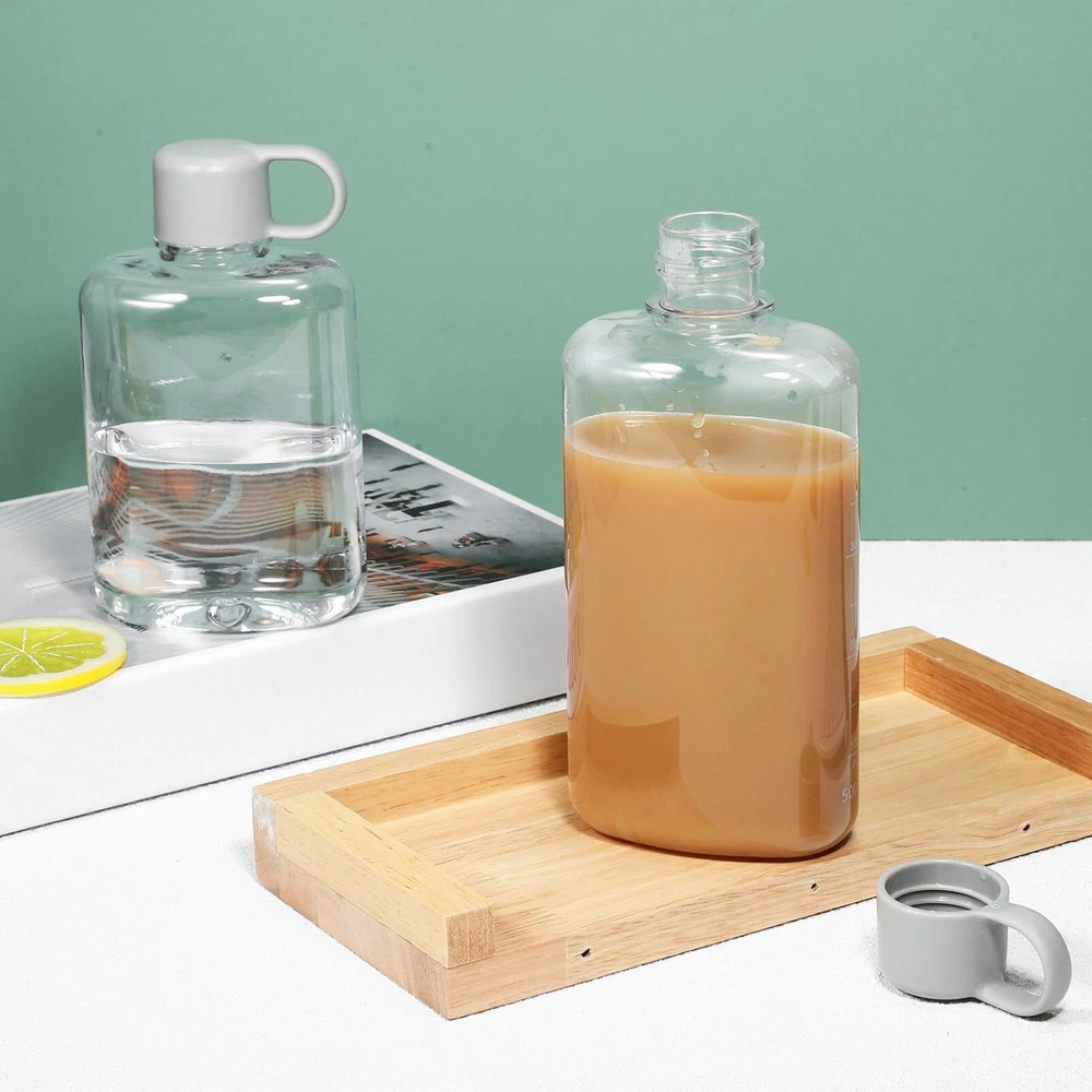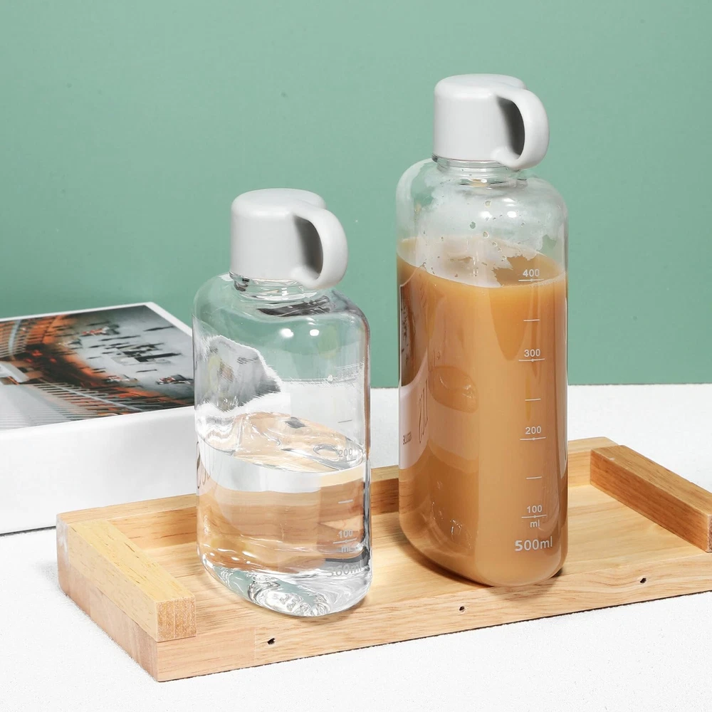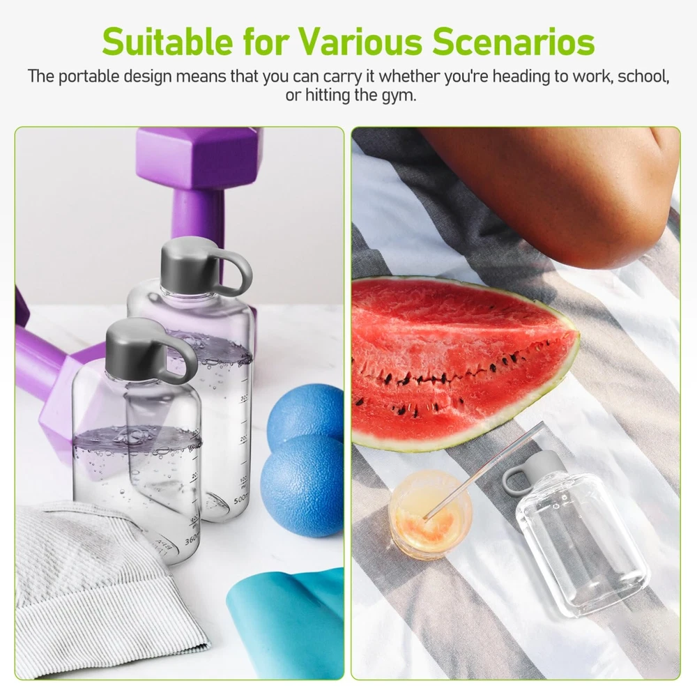 Portable Flat Water Bottle:Comes with 1pc water bottle(360 ml) and 1pc water bottle(500 ml). The body of this water bottle is totally clear for easy checking the amount of water and added fashion elements Plastic Travel Water Bottle:The bottle body is made from tritan material, which is safe for daily drinking, wont affect the taste of water. Each water bottle is carefully made with attention to detail, comfortable to the touch Flat Water Bottles For Travel:With the tightly sealed lid, the water bottle wont leak even if its upside down, keeping your bags dry. These water bottles are fit for backpacks, purse, handbags and even your pockets, easy to carry around Fitness Bottle: bottle can be carried with you, only takes up a small space, and has a cover, so you dont need to worry about spillage or leakage. Travel bottle very suitable for your schoolbag, backpacks, briefcase, handbag etc Portable Water Bottle:Reusable water bottle is for todays busy but healthy lifestyle. Also an excellent present for your family, friends, lover, etc. Drink with style and enjoy a healthy life