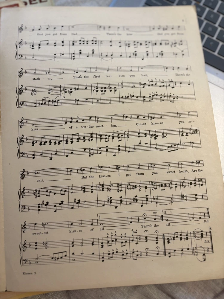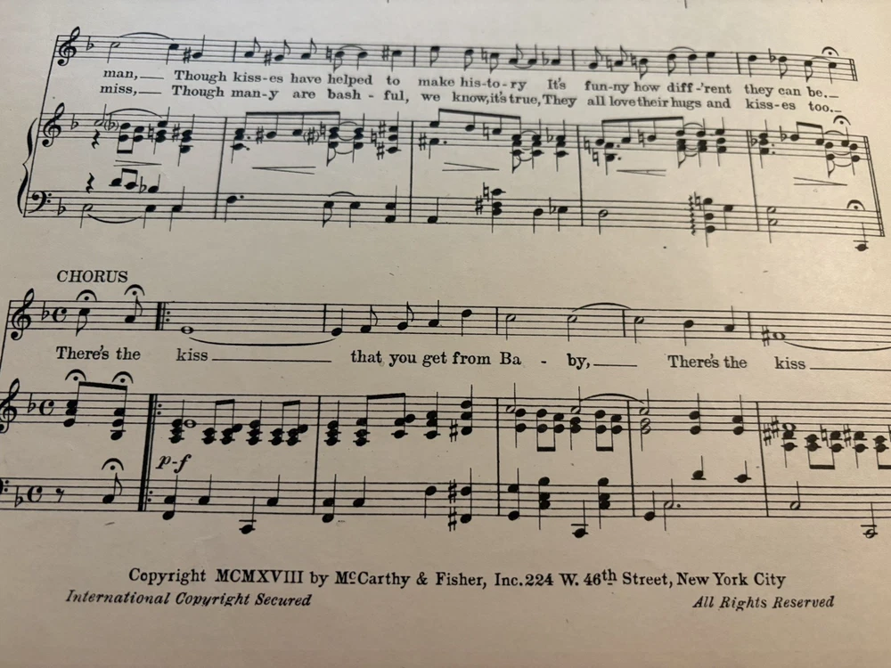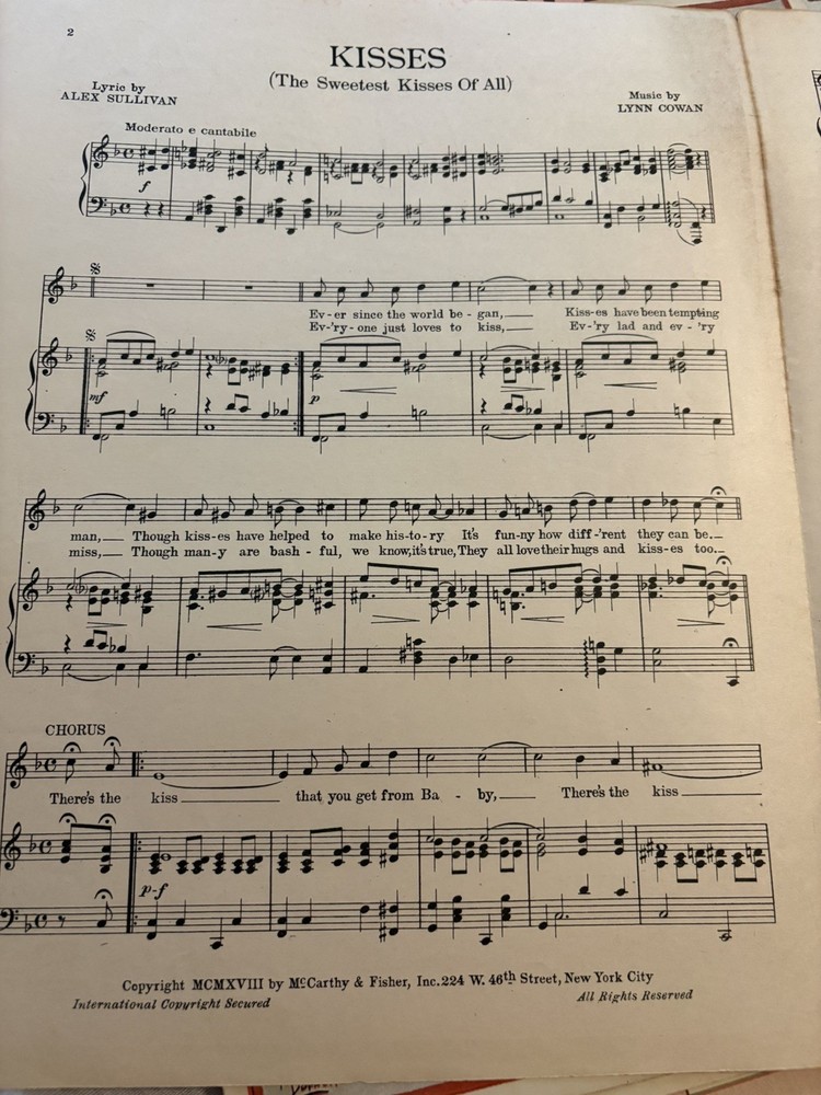 THIS LOOKS BRAND SPANKING NEW ACCEPT FOR PAPER AGING. PERFECTLY MINT. The product is a vintage sheet music titled "The Sweetest Kisses of All" by Cowan and Sullivan, published in 1918 by McCarthy and Fisher. It is designed for an orchestra ensemble with piano accompaniment, catering to intermediate-level musicians. The sheet music originates from the United States and falls under the genre of Musicals, providing a nostalgic and charming piece for musicians and collectors alike.