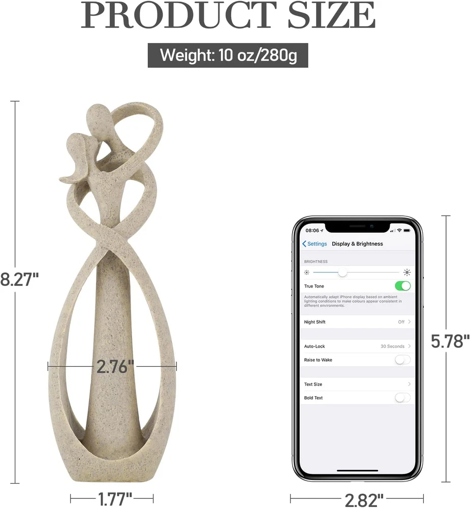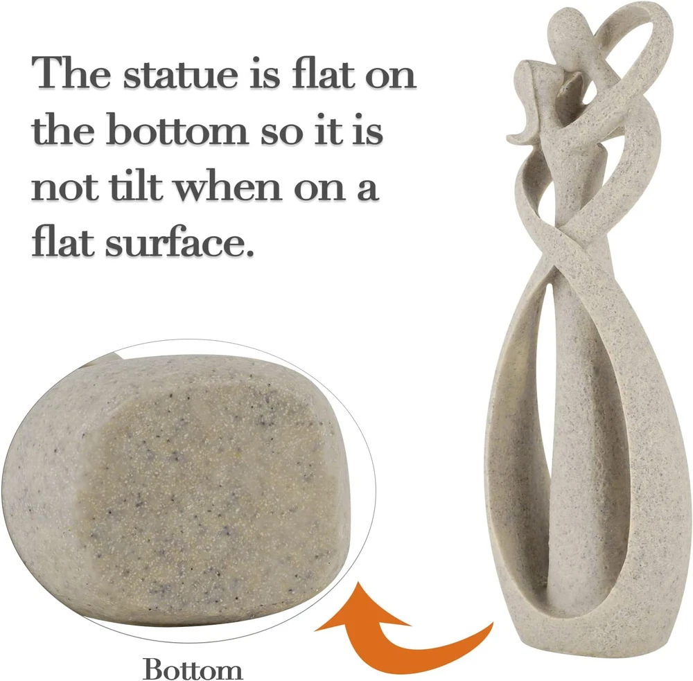 [Lovers Statue Size] Width: 2.76 inch/7cm, Height: 8.27 inch/21cm. [Lovers Sculpture Material] Made from Resin and Sandstone, solid structure and high quality. [Kissing Lovers Sculpture] Carved a pair of sweet lovers, abstract art form lover hug kiss design attract everyone's eyes, symbolizes the harmony and beauty of the family. [Decorative Statue] Fine workmanship and lifelike statue is a way to beautify your personal space, perfect decoration for home, office, library, canteens, cafes, tearooms, hotels decoration. [Great Choice] Excellent choice for family or friends. Product Description Affectionate Couple Art Resin Sculpture, Passionate Kiss Statue Romantic Figurine Home Decoration The couple hug and kiss each other tightly, surrounded by ribbons, which is very romantic and warm. This artistic couple statue ornament is the witness of love. Trycooling 8.27" H Affectionate Couple Kissing Statue Details Resin couple sculpture hug and kiss together Ribbon around the statue, more romantic design Depicted couple statue in an abstract art form Note 1. COLOR: The genuine color of the item may be slightly different from the pictures shown on the website due to many factors such as the brightness of the computer screen or the lighting levels. 2. SIZE: The size is measured by hand, so please allow a slight deviation within 1cm-2cm. Specifications: Material: Resin and Sandstone Color: Sandstone Color Weight: 10oz Size: 2.76" x 8.27" Package Included: 1 x Lovers Statue Great Anniversary Choice The beautiful kiss statue evokes love and companionship between husband and wife, showing the love between two lovers. This romantic kiss sculpture contains great humanistic feelings and is deeply loved by people. Placed on the table, it always exudes a harmonious atmosphere, reminding us to give more love to our loved ones. Describe the power of intimacy and love. Elegant, decent, artistic and contemporary design. Ideal for bookshelf and tabletop. When you want to use something to commemorate your loyal love with your loved one, it's your best choice. Sandstone Couple Figurines and Statues Carved a pair of sweet lovers, abstract couple statue form Lover Hug kiss design, symbolizes the harmony and beauty of the family. The surface of the product is finely polished, feels delicate and comfortable. Choice that capture a moment in time...a reminder of someone we love and want to keep close. Be constantly reminded of your spouse, boyfriend, or girlfriend with this passionate couple love statue. Great piece of art for living room, bedroom, kitchen bar, corridor, dining room, desktop, shelf, counter, etc. Small couple statue for couples: Ideal for Valentines Day, birthday, anniversary, Christmas, or anytime you want to show your love.