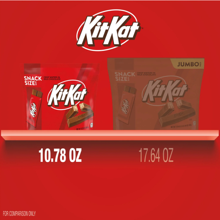 Kit Kat Milk Chocolate Wafer Snack Size Candy, Bag 10.78 oz About this item Product details Ready for a classic everyone hopes to find in the candy dish? These snack size KIT KAT milk chocolate wafer candy bars are individually wrapped for optimal convenience, easy sharing and lasting freshness. Whether you gift them to friends, pass them out in the office or hold onto them for snacking moments, you can expect a delicious treat in the perfect on-the-go size. Throw a few in your lunch box to treat yourself to a sweet dessert or stock your home and office candy bowls with an easy snacking classic. Contains one (1) 10.78-ounce bag of KIT KAT Milk Chocolate Wafer Snack Size Candy Bars Fill snack drawers, lunch boxes and candy dishes all year long with milk chocolate and wafer KIT KAT candy bars Kosher certified, snack size milk chocolate wafer candy bars individually wrapped for lasting freshness and convenience Be the biggest hit at the birthday, anniversary, retirement, graduation, new baby or wedding party with classic milk chocolate wafer candy everyone there knows and loves Place a whole or chopped KIT KAT candy bar on top of any cookies or brownies you bake for an extra sweet treat sure to become everyone's new favorite Specifications Food Allergen Statements Contains Wheat, Soy, Milk Food Form Whole Brand KITKAT