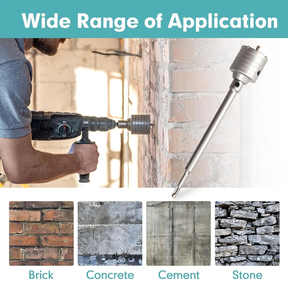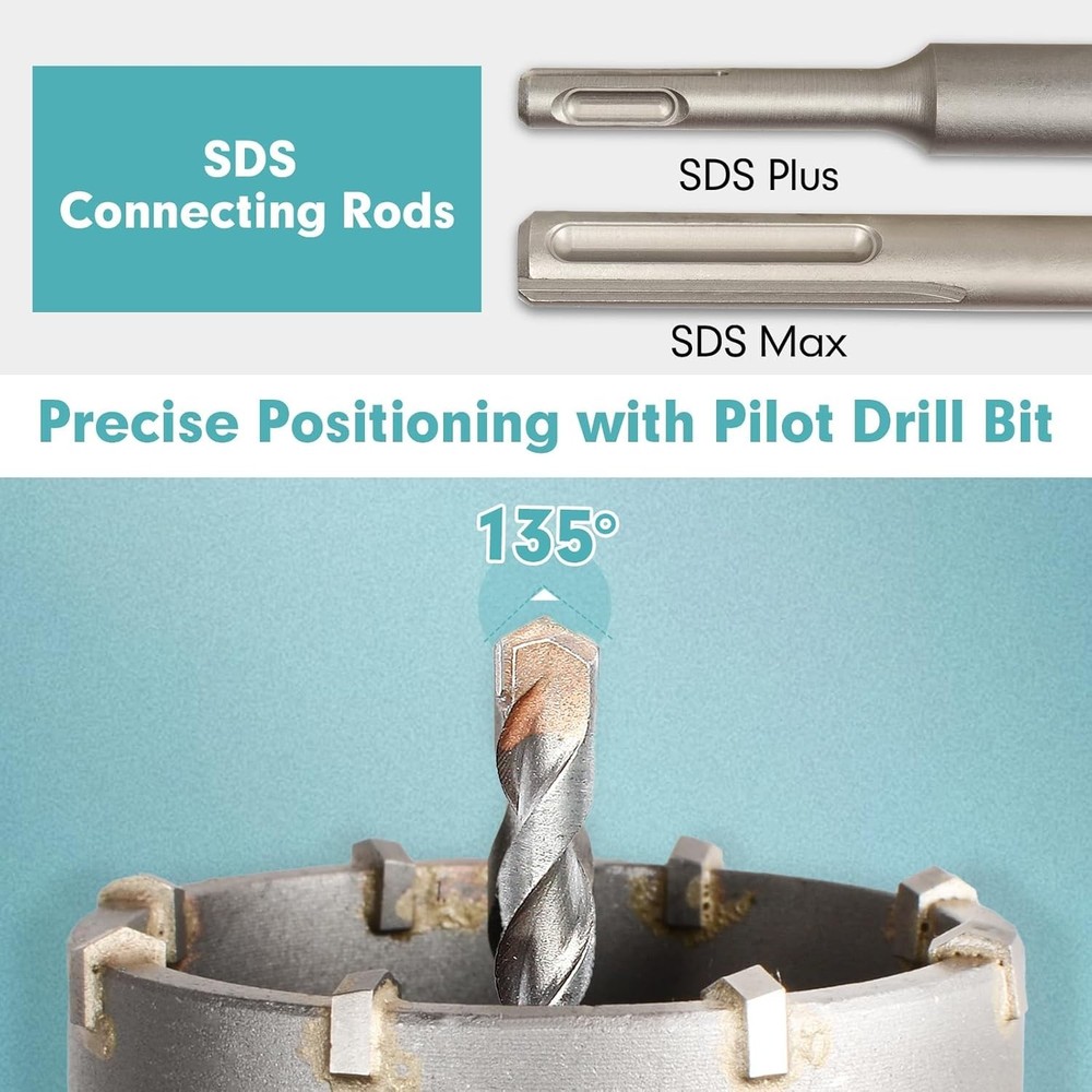 Producto de alta calidad: fabricado con acero de primera calidad y carburo de tungsteno, nuestro producto cuenta con alta dureza, resistencia al desgaste, resistencia al impacto y excelente rendimiento de corte; Estas características garantizan que la sierra de corona se mantenga afilada durante un uso prolongado, lo que reduce el desgaste; Además, la superior resistencia al impacto de las sierras de corona les permite soportar golpes y presiones de alta intensidad sin romperse ni deformarse fácilmente. Amplia gama de tamaños: El juego incluye 5 sierras de corona de 30 mm a 90 mm de diámetro (30 mm, 40 mm, 65 mm, 80 mm y 100 mm) y 2 brocas piloto. También incluye vástagos SDS Plus y SDS Max, lo que lo hace compatible con los martillos perforadores SDS Plus y SDS Max, satisfaciendo así la mayoría de sus necesidades de perforación. Fácil instalación: Simplemente inserte la broca piloto en la biela, asegure el tornillo y fije la sierra de corona en el extremo. Estos 3 pasos rápidos permiten una configuración rápida y cómoda. Punta de broca de 135°: La broca piloto cuenta con una punta de 135°, lo que mejora la eficiencia del trabajo con un posicionamiento más preciso, lo que facilita la perforación. Tareas más fáciles y eficientes en tiempo Amplia aplicación: Este juego de sierras de corona es adecuado para todos los taladros de percusión rotativos con soportes SDS Plus o SDS Max; puede manejar fácilmente materiales de pared como ladrillo, hormigón, adobe y piedra; es particularmente hábil para perforar agujeros en paredes o instalar tuberías, mangueras de escape y tareas similares