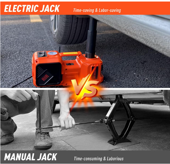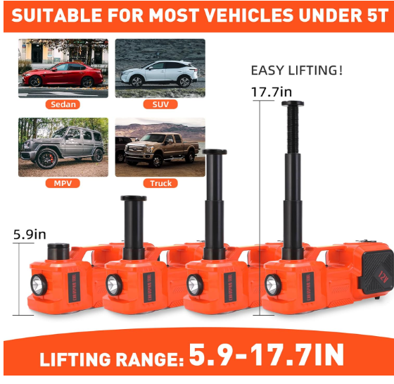 Kit de gato eléctrico hidráulico 5T para coche, con bomba de inflado y llave de impacto integradas, perfecto para cambios de neumáticos y reparaciones en garaje. Gato Eléctrico 5T: Alimentado por un motor de 12 V, se conecta al encendedor de cigarrillos o a la corriente del automóvil. Con un solo botón, eleva la mayoría de los vehículos de menos de 5 toneladas a una altura máxima de 45 cm en 2 minutos. Bomba de aire integrada para un inflado rápido y un cambio de neumáticos sencillo. Potente llave de impacto: Este kit de gato para automóvil incluye una llave de impacto eléctrica con carcasa de ABS, cuerpo de acero inoxidable y motor de cobre de alto rendimiento. Ofrece bajo nivel de ruido, alta potencia y un potente par para una rápida extracción de pernos y una rotación de 360°. Uso versátil: Este kit de gato para automóvil integra funciones de elevación, inflado, iluminación y extracción de neumáticos. Su compresor de aire integrado infla los neumáticos a 35 L/min en 2 minutos, mientras que la luz LED integrada facilita el cambio de neumáticos por la noche. Garantía de seguridad: Este gato eléctrico 5T cuenta con una parada automática a la altura máxima para evitar caídas repentinas durante un corte de energía, con liberación manual para un descenso seguro. El disyuntor integrado evita sobrecargas. Compañero perfecto para el coche: Imprescindible para su coche, ideal para viajes largos o zonas remotas. Reemplace fácilmente los neumáticos sin esfuerzo manual ni ayuda externa. Ideal para garajes, granjas, carreteras y aventuras en carretera.